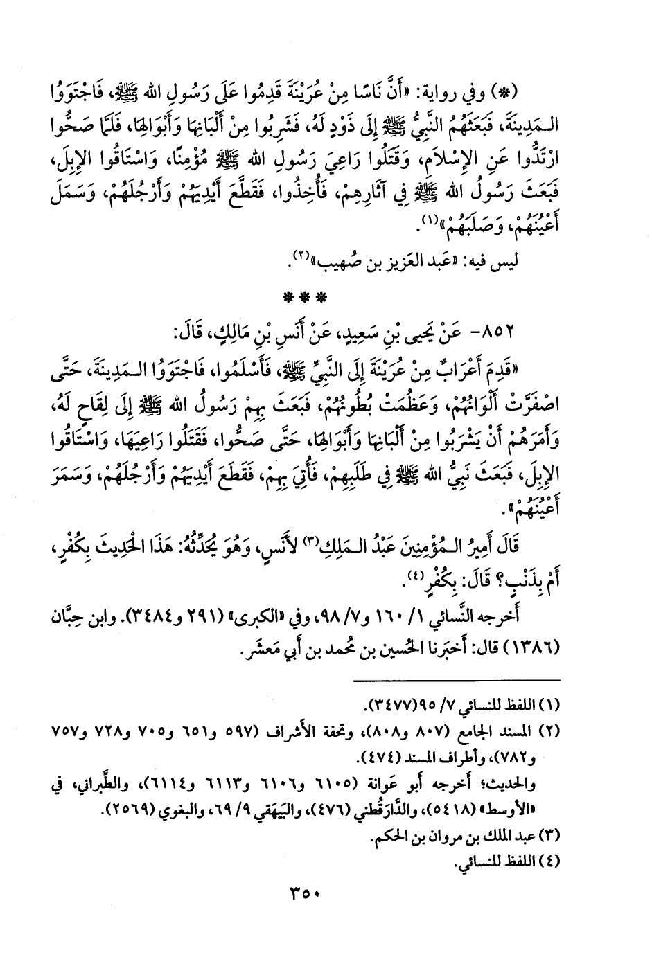 - وفي رواية: «أن ناسا من عرينة قدموا على رسول الله صَلى الله عَليه وسَلم فاجتووا المدينة، فبعثهم النبي صَلى الله عَليه وسَلم إلى ذود له، فشربوا من ألبانها وأَبوالها، فلما صحوا ارتدوا عن الإسلام، وقتلوا راعي رسول الله صَلى الله عَليه وسَلم مؤمنا، واستاقوا الإبل، فبعث رسول الله صَلى الله عَليه وسَلم في آثارهم، فأخذوا، فقطع أيديهم وأرجلهم، وسمل أعينهم، وصلبهم» (¬١).