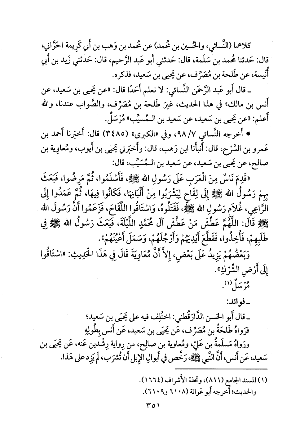 - وقال الدارقُطني: حديث العرنيين، وفيه ذكر عبد الملك بن مروان، غريب من حديث طلحة بن مُصَرِّف، عن يحيى، عن أَنس، تفرد به زيد بن أَبي أُنيسة عن طلحة، عنه. «أطراف الغرائب والأفراد» (١٢٨٧).