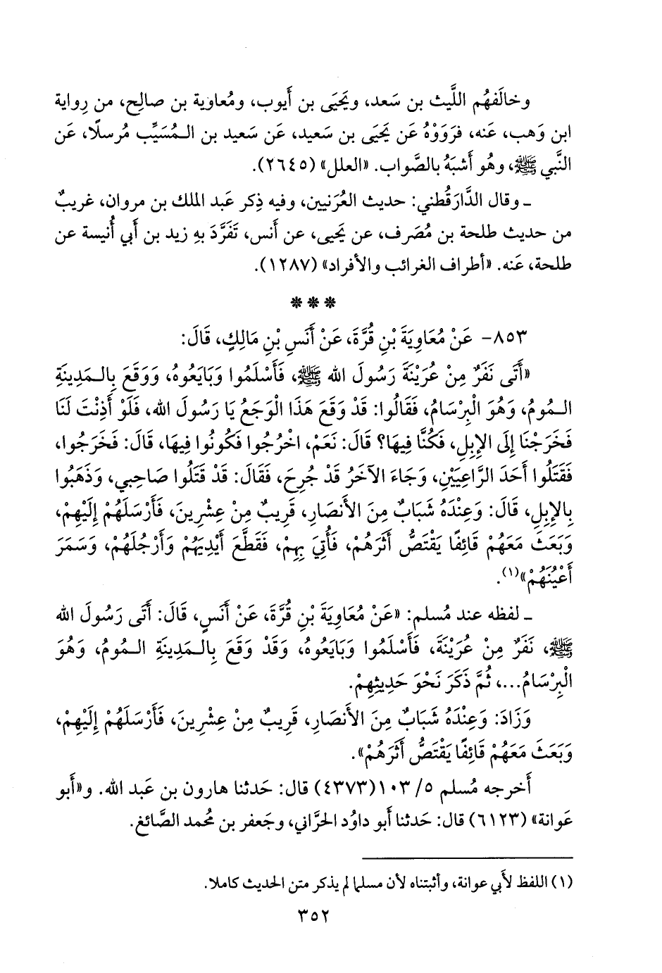 - لفظه عند مسلم: «عن معاوية بن قرة، عن أَنس، قال: أتى رسول الله صَلى الله عَليه وسَلم نفر من عرينة، فأسلموا وبايعوه، وقد وقع بالمدينة الموم، وهو البرسام ... ، ثم ذكر نحو حديثهم.