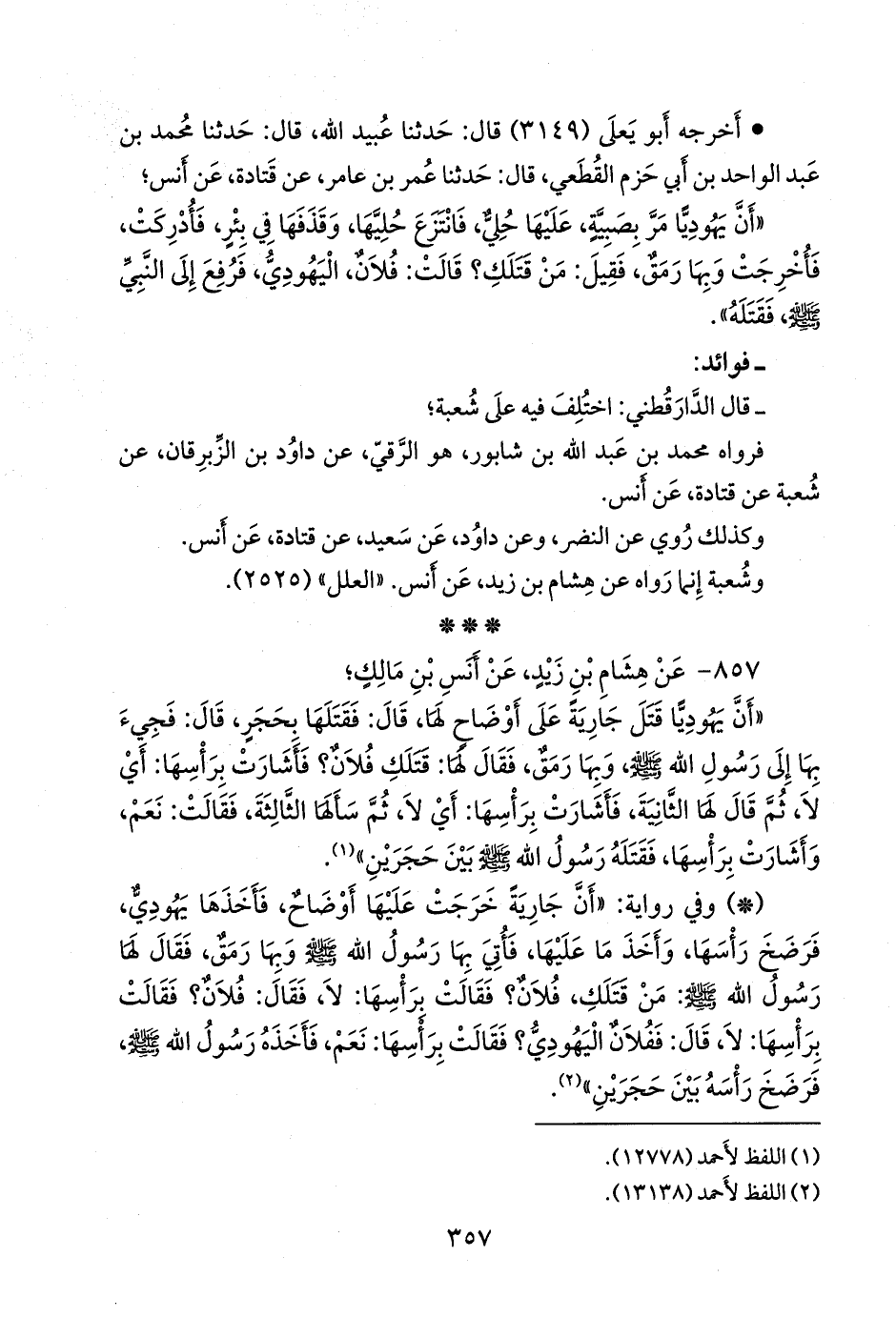 - وفي رواية: «عدا يهودي، في عهد رسول الله صَلى الله عَليه وسَلم على جارية، فأخذ أوضاحا كانت عليها، ورضخ رأسها، فأتى بها أهلها رسول الله صَلى الله عَليه وسَلم وهي في آخر رمق، وقد أصمتت، فقال لها رسول الله صَلى الله عَليه وسَلم: من قتلك، فلان، لغير الذي قتلها؟ فأشارت برأسها: أن لا، قال: فقال لرجل آخر، غير الذي قتلها، فأشارت: أن لا، فقال: ففلان، لقاتلها، فأشارت: أن نعم، فأمر به رسول الله صَلى الله عَليه وسَلم فرضخ رأسه بين حجرين» (¬٣).