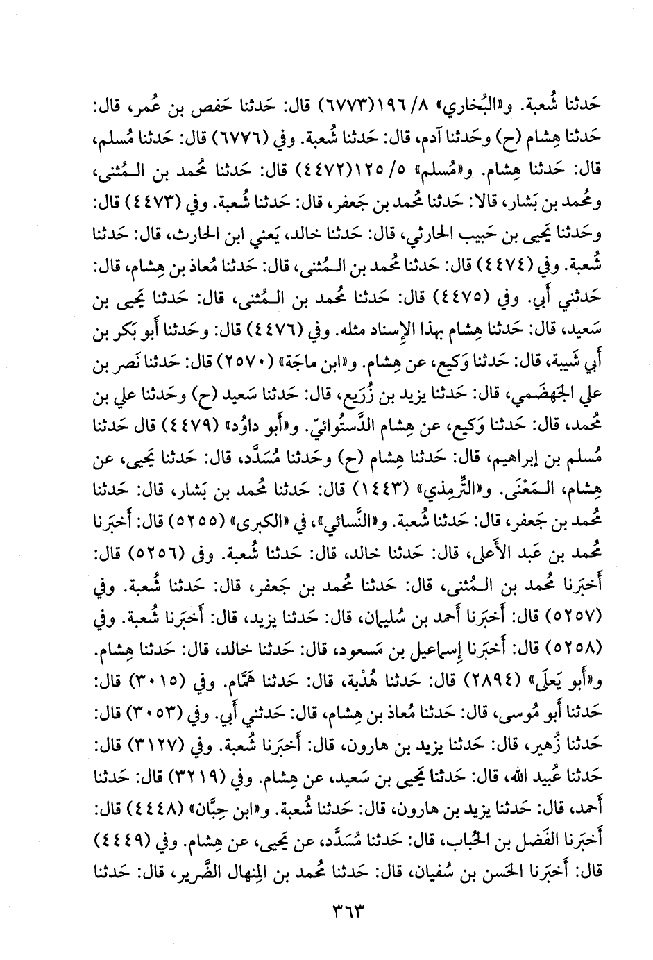 وفي (٤٤٧٦) قال: وحدثنا أَبو بكر بن أبي شيبة، قال: حدثنا وكيع، عن هشام. و «ابن ماجة» (٢٥٧٠) قال: حدثنا نصر بن علي الجهضمي، قال: حدثنا يزيد بن زُريع، قال: حدثنا سعيد (ح) وحدثنا علي بن محمد، قال: حدثنا وكيع، عن هشام الدَّستوائي. و «أَبو داود» (٤٤٧٩) قال: حدثنا مسلم بن إبراهيم، قال: حدثنا هشام (ح) وحدثنا مُسدد، قال: حدثنا يحيى، عن هشام، المعنى. و «التِّرمِذي» (١٤٤٣) قال: حدثنا محمد بن بشار، قال: حدثنا محمد بن جعفر، قال: حدثنا شعبة. و «النَّسَائي» في «الكبرى» (٥٢٥٥) قال: أخبرنا محمد بن عبد الأعلى، قال: حدثنا خالد، قال: حدثنا شعبة. وفي (٥٢٥٦) قال: أخبرنا محمد بن المثنى، قال: حدثنا محمد بن جعفر، قال: حدثنا شعبة. وفي (٥٢٥٧) قال: أخبرنا أحمد بن سليمان، قال: حدثنا يزيد، قال: أخبرنا شعبة. وفي (٥٢٥٨) قال: أخبرنا إسماعيل بن مسعود، قال: حدثنا خالد، قال: حدثنا هشام. و «أَبو يَعلى» (٢٨٩٤) قال: حدثنا هُدبة، قال: حدثنا همام. وفي (٣٠١٥) قال: حدثنا أَبو موسى، قال: حدثنا معاذ بن هشام، قال: حدثني أبي. وفي (٣٠٥٣) قال: حدثنا زهير، قال: حدثنا يزيد بن هارون، قال: أخبرنا شعبة. وفي (٣١٢٧) قال: حدثنا عُبيد الله، قال: حدثنا يحيى بن سعيد، عن هشام. وفي (٣٢١٩) قال: حدثنا أحمد، قال: حدثنا يزيد بن هارون، قال: حدثنا شعبة. و «ابن حِبَّان» (٤٤٤٨) قال: أخبرنا الفضل بن الحُبَاب، قال: حدثنا مُسدد، عن يحيى، عن هشام. وفي (٤٤٤٩) قال: أخبرنا الحسن بن سفيان، قال: حدثنا محمد بن المنهال الضرير، قال: حدثنا