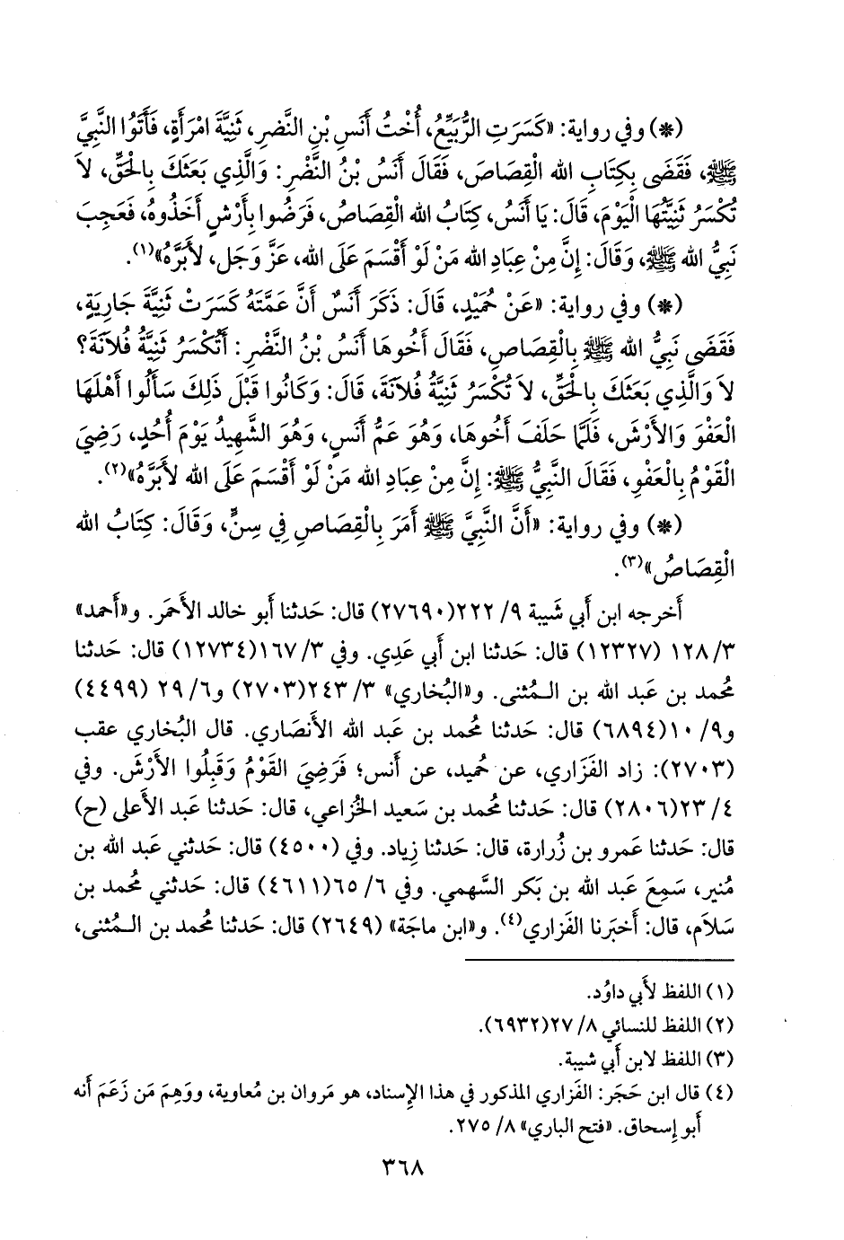 - وفي رواية: «أن النبي صَلى الله عَليه وسَلم أمر بالقصاص في سن، وقال: كتاب الله القصاص» (¬١).