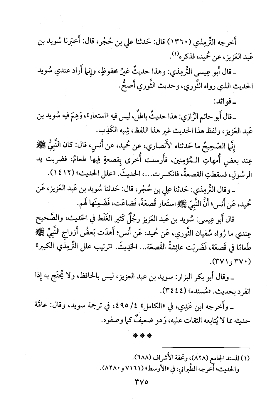 قال أَبو عيسى: سويد بن عبد العزيز رجل كثير الغلط في الحديث، والصحيح عندي ما رواه سفيان الثوري، عن حميد، عن أَنس؛ أهدت بعض أزواج النبي صَلى الله عَليه وسَلم طعاما في قصعة، فضربت عائشة القصعة، الحديث. «ترتيب علل التِّرمِذي الكبير» (٣٧٠ و ٣٧١).