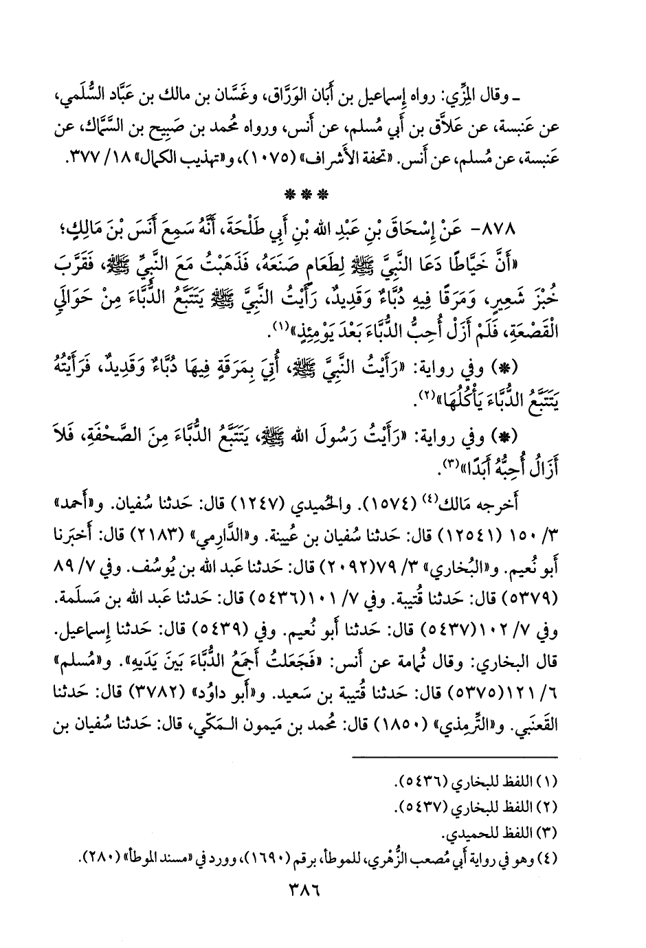 وفي ٧/ ٧٨ (٥٤٣٧) قال: حدثنا أَبو نُعيم. وفي (٥٤٣٩) قال: حدثنا إسماعيل. قال البخاري: وقال ثمامة عن أَنس: «فجعلت أجمع الدُّبَّاء بين يديه». و «مسلم» ٦/ ١٢١ (٥٣٧٥) قال: حدثنا قتيبة بن سعيد. و «أَبو داود» (٣٧٨٢) قال: حدثنا القَعنَبي. و «التِّرمِذي» (١٨٥٠) قال: محمد بن ميمون المكي، قال: حدثنا سفيان بن