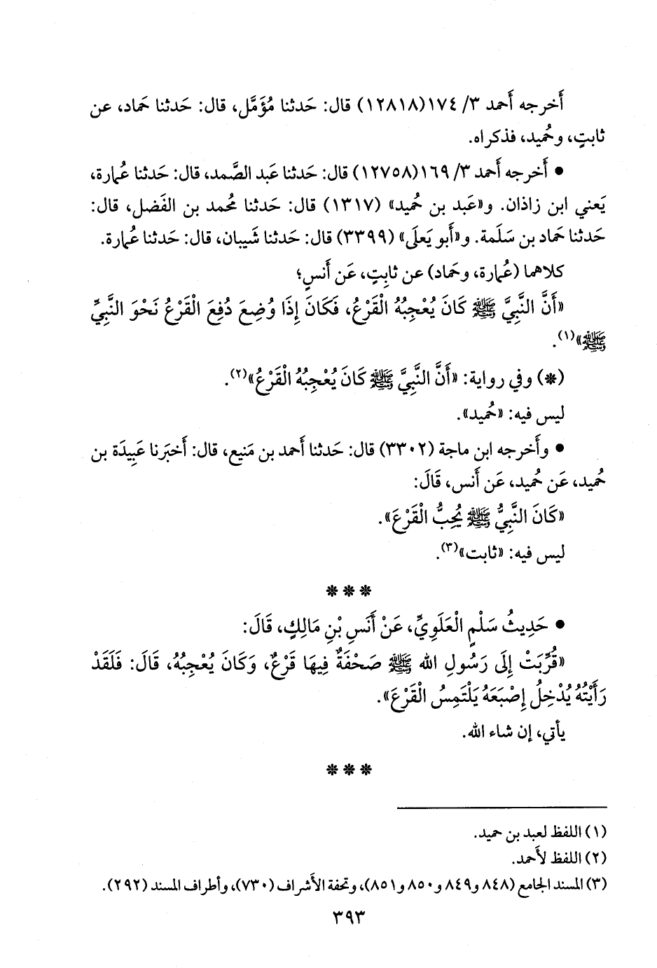 «قربت إلى رسول الله صَلى الله عَليه وسَلم صحفة فيها قرع، وكان يعجبه، قال: فلقد رأيته يدخل إصبعه يلتمس القرع».