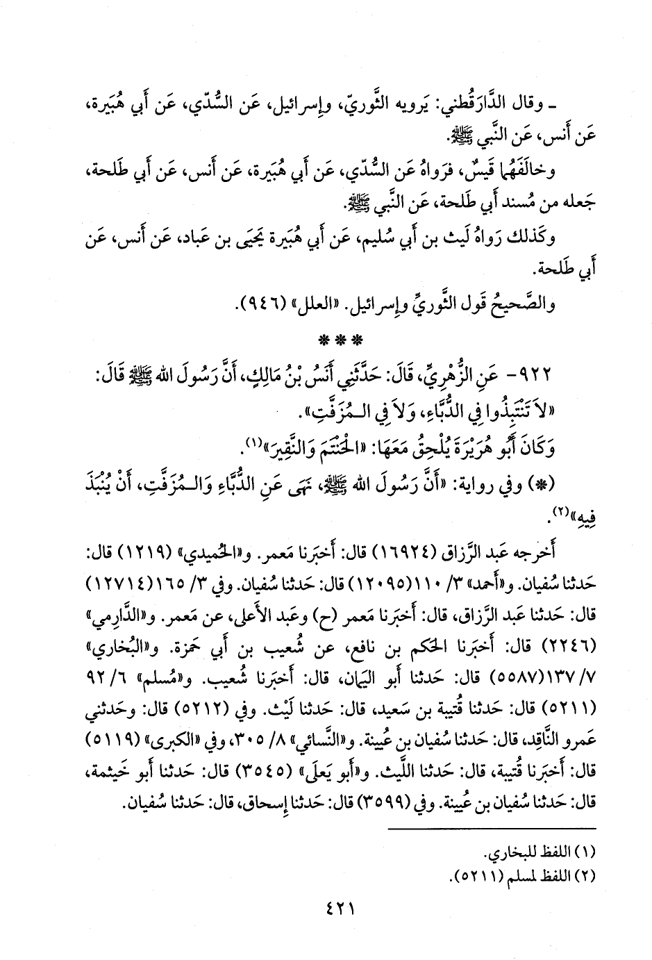 ٩٢٢ - عن محمد بن مسلم بن شهاب الزُّهْري، قال: حدثني أَنس بن مالك، أن رسول الله صَلى الله عَليه وسَلم قال: