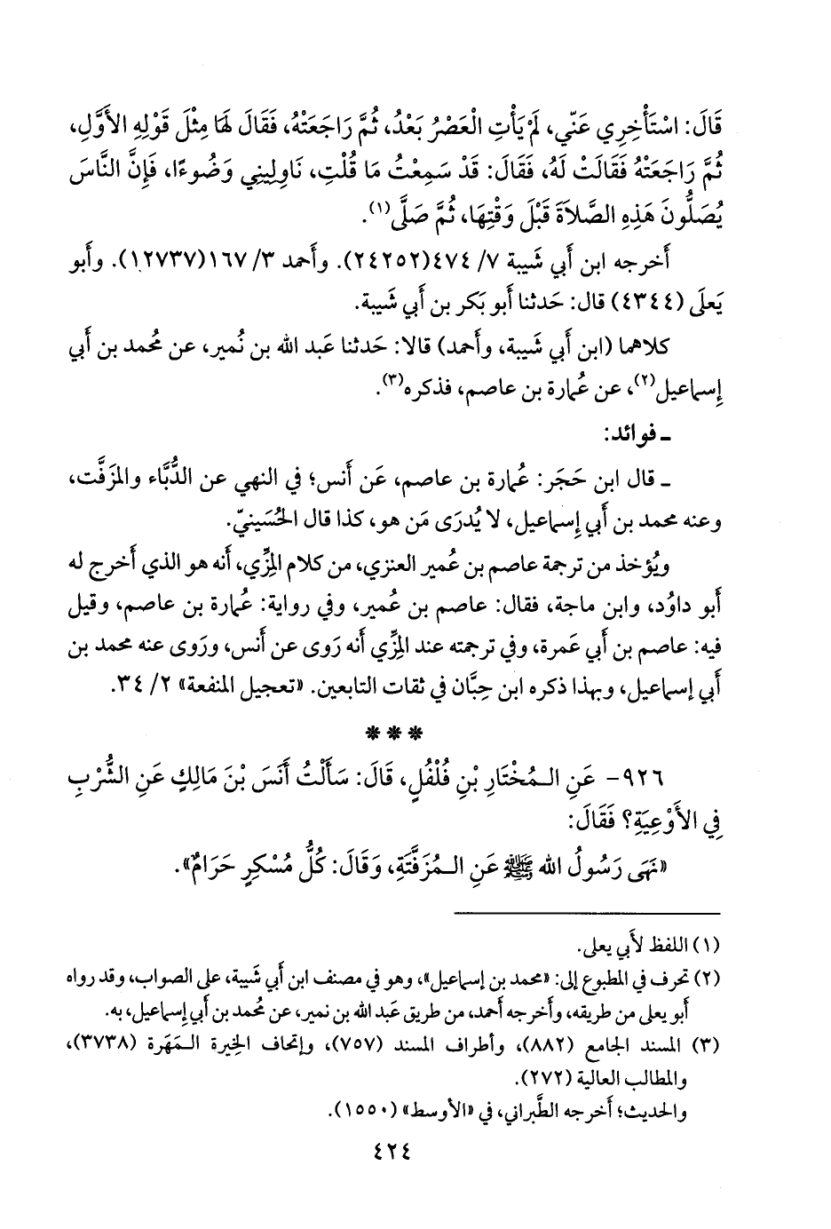 ٩٢٦ - عن المختار بن فلفل، قال: سألت أَنس بن مالك عن الشرب في الأوعية؟ فقال: