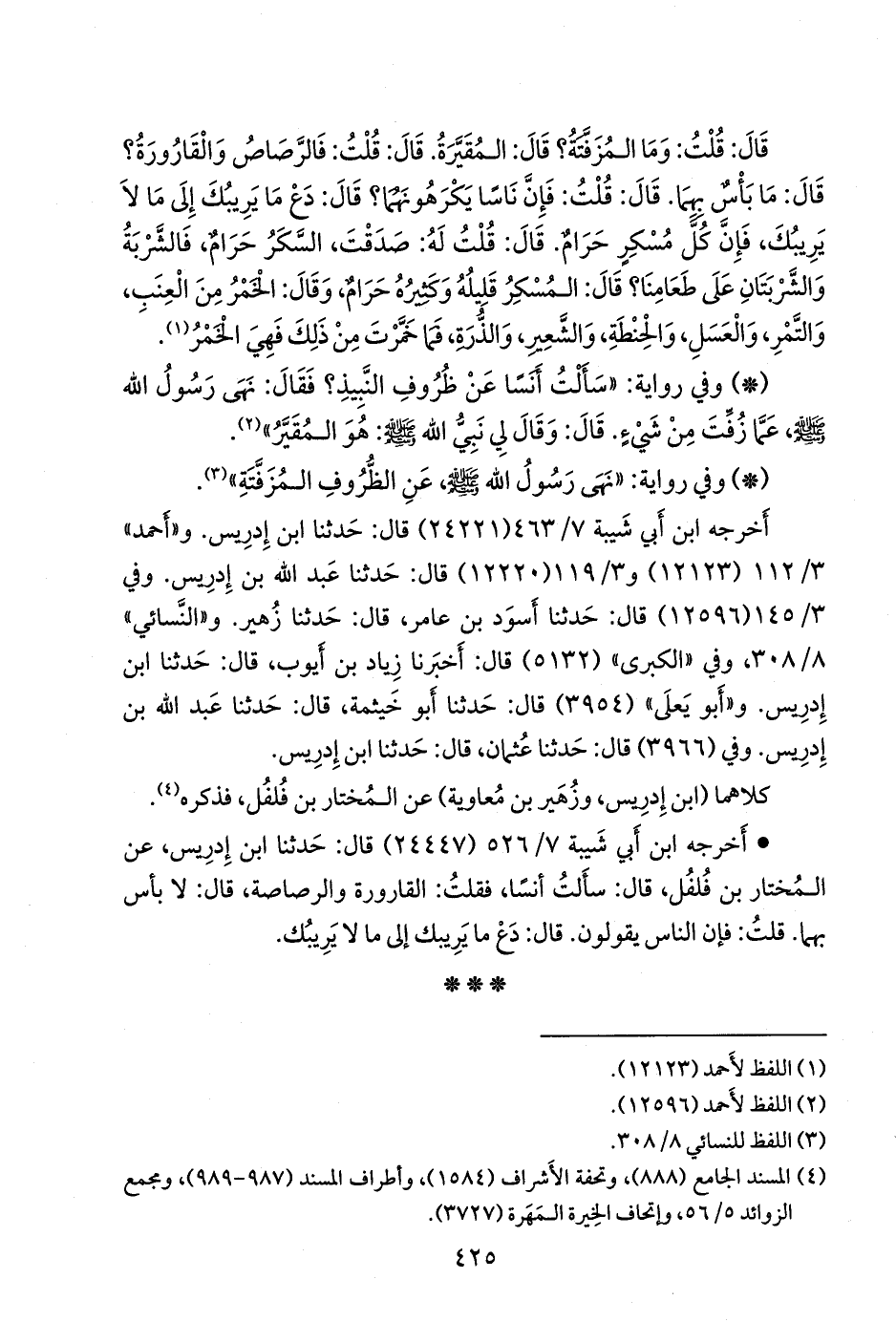 - أخرجه ابن أَبي شيبة (٢٤٤٤٧) قال: حدثنا ابن إِدريس، عن المُختار بن فُلفُل، قال: سأَلتُ أَنسًا، فقلتُ: القارورة والرصاصة، قال: لا بأس بهما. قلتُ: فإِن الناس يقولون. قال: دَعْ ما يَريبُك إلى ما لا يَريبُك. «موقوفٌ».