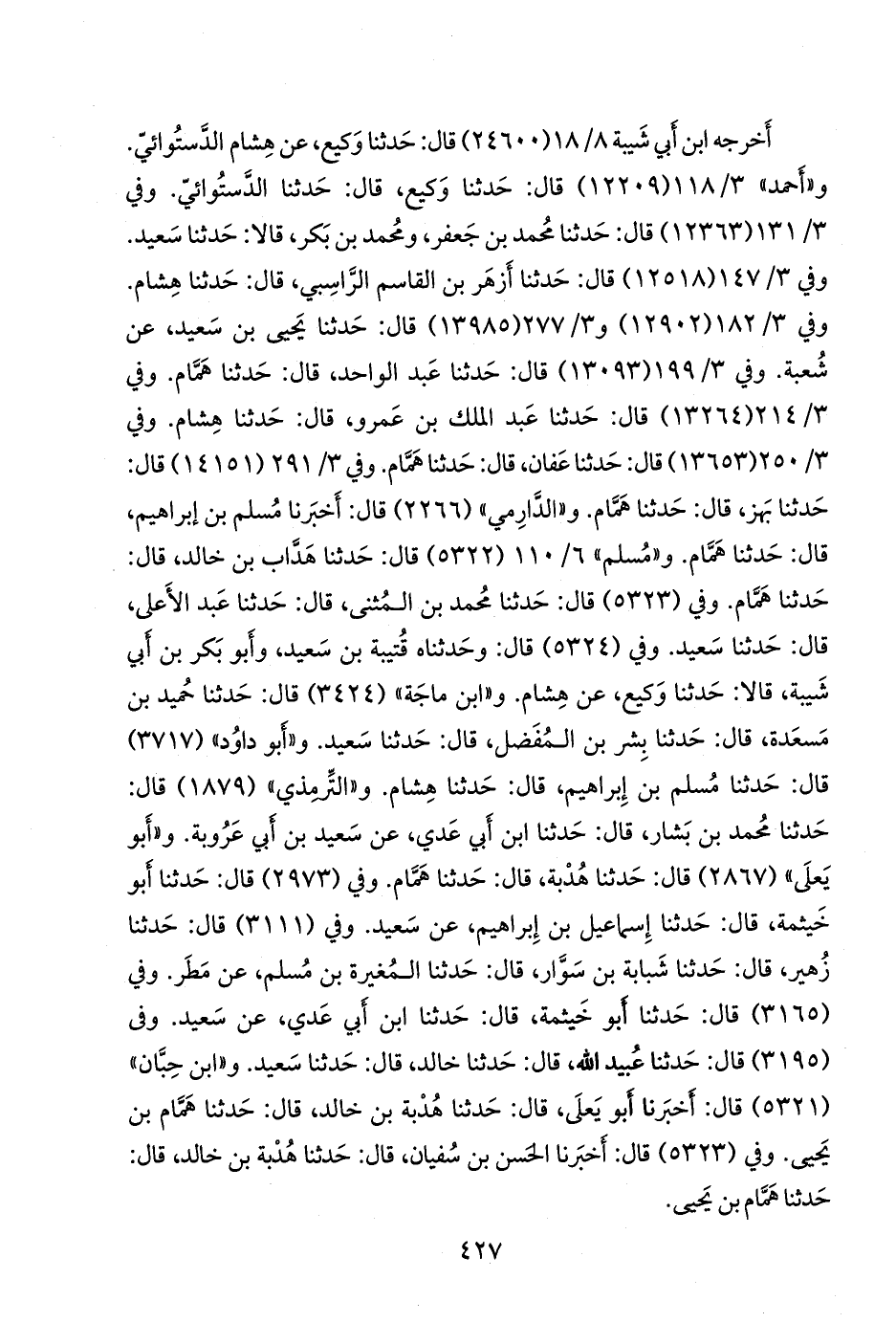 وفي (٥٣٢٣) قال: حدثنا محمد بن المثنى، قال: حدثنا عبد الأعلى، قال: حدثنا سعيد. وفي (٥٣٢٤) قال: وحدثناه قتيبة بن سعيد، وأَبو بكر بن أبي شيبة, قالا: حدثنا وكيع، عن هشام. و «ابن ماجة» (٣٤٢٤) قال: حدثنا حميد بن مَسعَدة، قال: حدثنا بشر بن المُفَضَّل، قال: حدثنا سعيد. و «أَبو داود» (٣٧١٧) قال: حدثنا مسلم بن إبراهيم، قال: حدثنا هشام. و «التِّرمِذي» (١٨٧٩) قال: حدثنا محمد بن بشار، قال: حدثنا ابن أَبي عَدي، عن سعيد بن أبي عَروبَة. و «أَبو يَعلى» (٢٨٦٧) قال: حدثنا هُدبة، قال: حدثنا همام. وفي (٢٩٧٣) قال: حدثنا أَبو خيثمة، قال: حدثنا إسماعيل بن إبراهيم، عن سعيد. وفي (٣١٦٥) قال: حدثنا أَبو خيثمة، قال: حدثنا ابن أَبي عَدي، عن سعيد. وفي (٣١٩٥) قال: حدثنا عُبيد الله، قال: حدثنا خالد، قال: حدثنا سعيد. و «ابن حِبَّان» (٥٣٢١) قال: أخبرنا أَبو يَعلى، قال: حدثنا هُدبة بن خالد، قال: حدثنا همام بن يحيى. وفي (٥٣٢٣) قال: أخبرنا الحسن بن سفيان، قال: حدثنا هُدبة بن خالد، قال: حدثنا همام بن يحيى.
