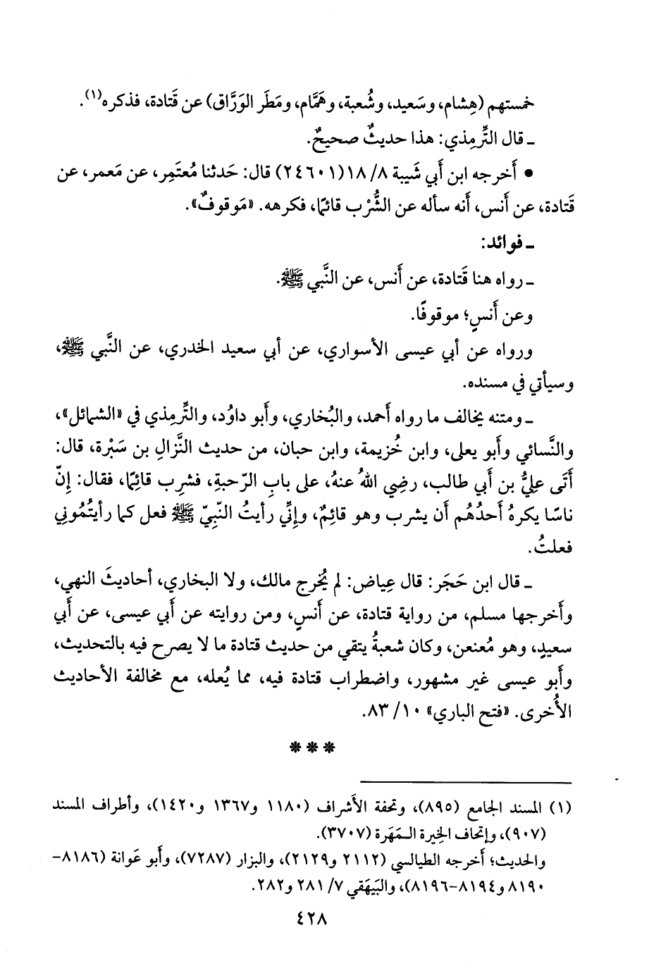 - قلنا: متنه يخالف حديث النَّزال بن سَبْرة، قال: أَتَى علي بن أَبي طالب، رضي الله عنه، على باب الرَّحْبة، فشرب قائمًا، فقال: إِن ناسًا يَكرهُ أَحدُهم أَن يشرب وهو قائمٌ، وإِني رأَيتُ النبي صَلى الله عَليه وسَلم فعل كما رأَيتُموني فعلتُ. ويأتي بتمام طرقه ورواياته برقم (٩٤٤٣).