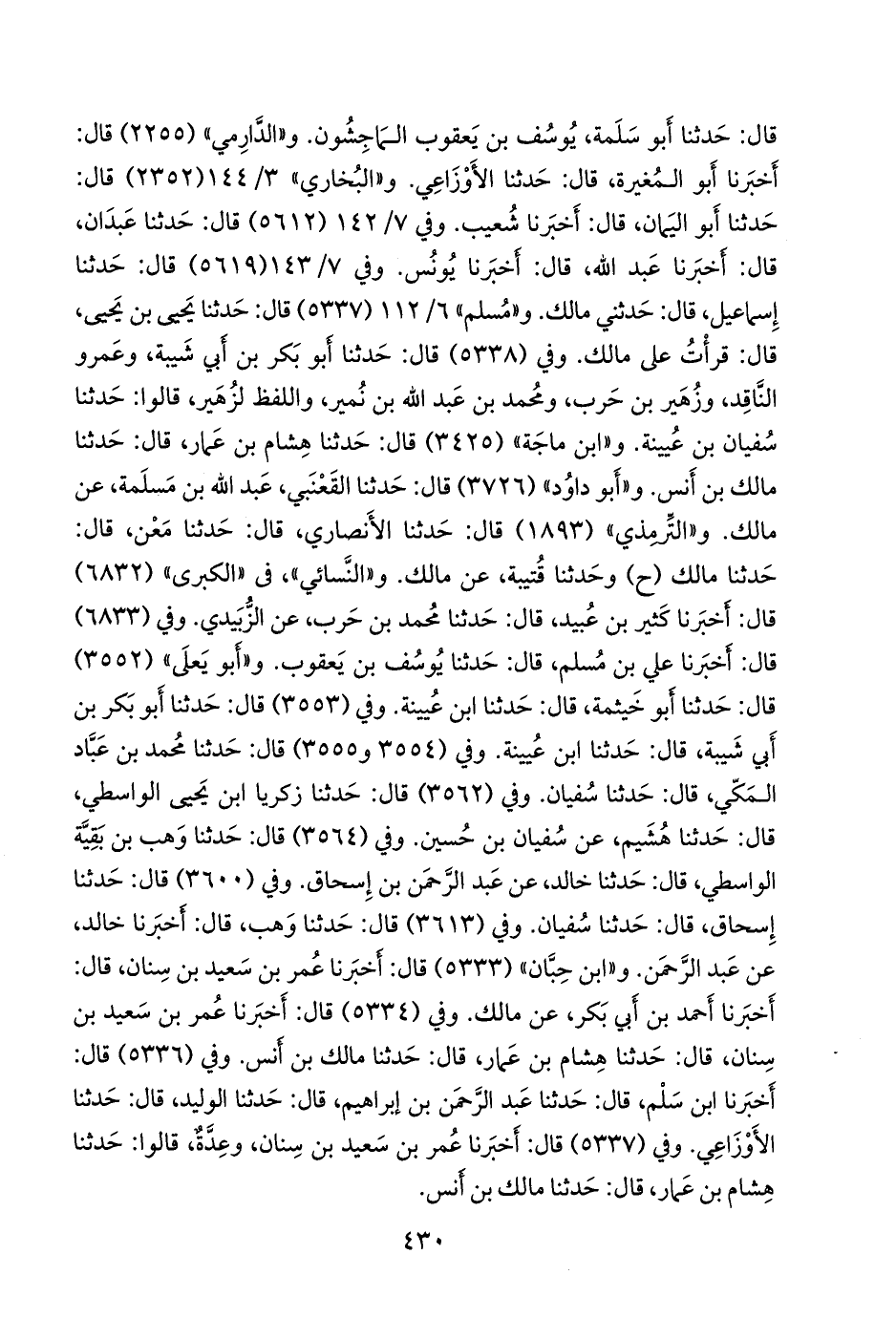 وفي (٥٣٣٦) قال: أخبرنا ابن سلم، قال: حدثنا عبد الرَّحمَن بن إبراهيم، قال: حدثنا الوليد، قال: حدثنا الأوزاعي. وفي (٥٣٣٧) قال: أخبرنا عمر بن سعيد بن سنان، وعدة، قالوا: حدثنا هشام بن عمار، قال: حدثنا مالك بن أنس.