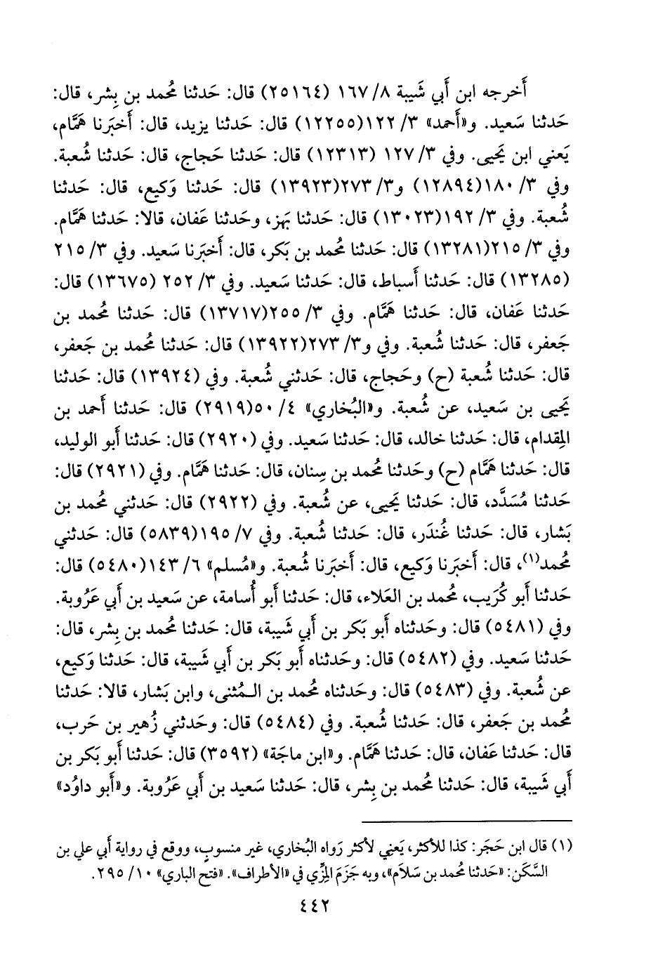 وفي ٣/ ٢٥٢ (١٣٦٧٥) قال: حدثنا عفان، قال: حدثنا همام. وفي ٣/ ٢٥٥ (١٣٧١٧) قال: حدثنا محمد بن جعفر، قال: حدثنا شعبة. وفي و ٣/ ٢٧٣ (١٣٩٢٢) قال: حدثنا محمد بن جعفر، قال: حدثنا شعبة (ح) وحجاج، قال: حدثني شعبة. وفي (١٣٩٢٤) قال: حدثنا يحيى بن سعيد، عن شعبة. و «البخاري» ٤/ ٤٢ (٢٩١٩) قال: حدثنا أحمد بن المقدام، قال: حدثنا خالد، قال: حدثنا سعيد. وفي (٢٩٢٠) قال: حدثنا أَبو الوليد، قال: حدثنا همام (ح) وحدثنا محمد بن سنان، قال: حدثنا همام. وفي (٢٩٢١) قال: حدثنا مُسدد، قال: حدثنا يحيى، عن شعبة. وفي (٢٩٢٢) قال: حدثني محمد بن بشار، قال: حدثنا غُندَر، قال: حدثنا شعبة. وفي ٧/ ١٥١ (٥٨٣٩) قال: حدثني محمد (¬١)، قال: أخبرنا وكيع، قال: أخبرنا شعبة. و «مسلم» ٦/ ١٤٣ (٥٤٨٠) قال: حدثنا أَبو كُريب محمد بن العلاء، قال: حدثنا أَبو أُسامة، عن سعيد بن أبي عَروبَة. وفي (٥٤٨١) قال: وحدثناه أَبو بكر بن أبي شيبة، قال: حدثنا محمد بن بشر، قال: حدثنا سعيد. وفي (٥٤٨٢) قال: وحدثناه أَبو بكر بن أبي شيبة، قال: حدثنا وكيع، عن شعبة. وفي (٥٤٨٣) قال: وحدثناه محمد بن المثنى، وابن بشار، قالا: حدثنا محمد بن جعفر، قال: حدثنا شعبة. وفي (٥٤٨٤) قال: وحدثني زهير بن حرب، قال: حدثنا عفان، قال: حدثنا همام. و «ابن ماجة» (٣٥٩٢) قال: حدثنا أَبو بكر بن أبي شيبة، قال: حدثنا محمد بن بشر، قال: حدثنا سعيد بن أبي عَروبَة. و «أَبو داود»