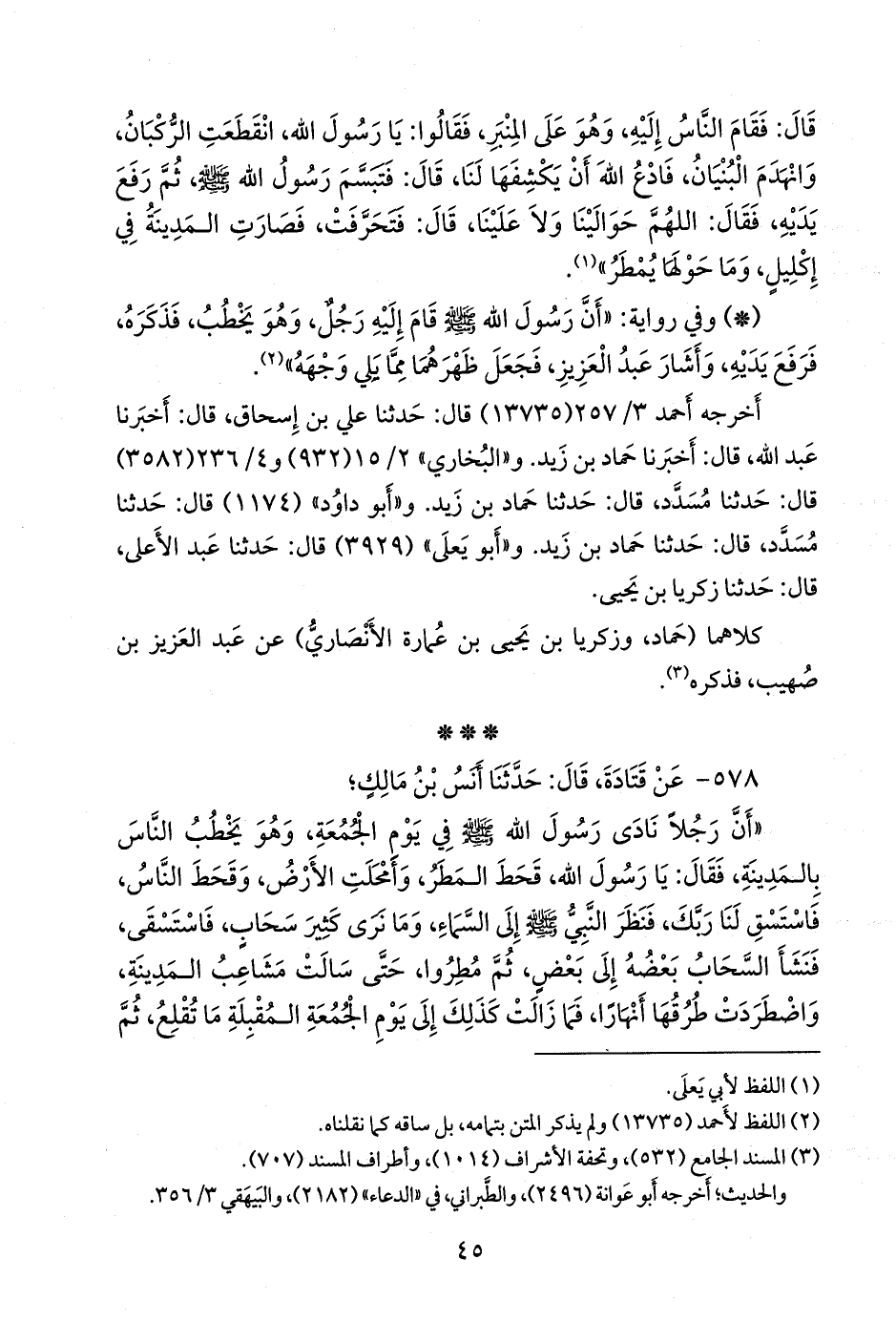 - وفي رواية: «أن رسول الله صَلى الله عَليه وسَلم قام إليه رجل، وهو يخطب، فذكره، فرفع يديه، وأشار عبد العزيز، فجعل ظهرهما مما يلي وجهه» (¬١).