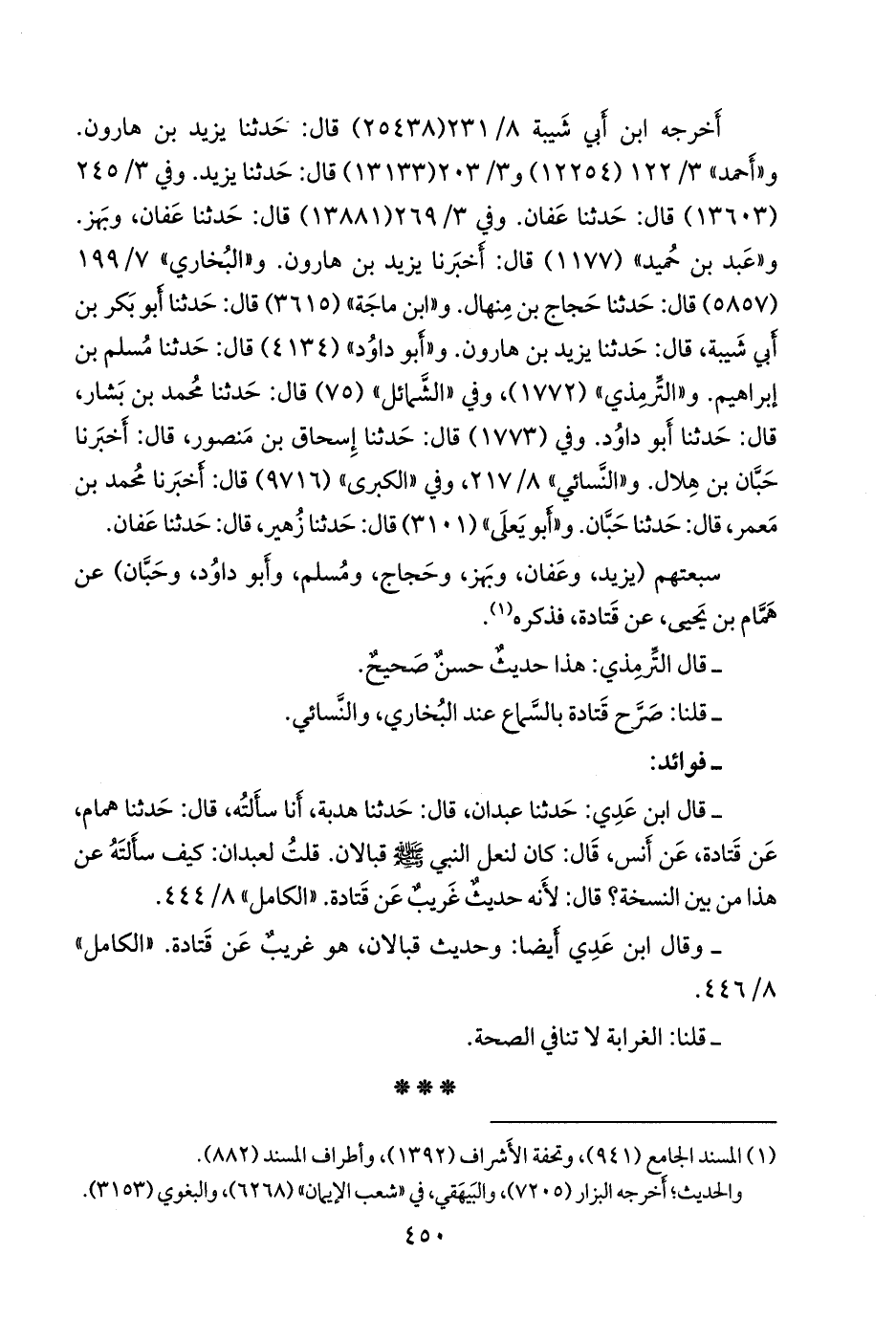 سبعتهم (يزيد، وعفان، وبَهز، وحجاج، ومسلم، وأَبو داود، وحبان) عن همام بن يحيى، عن قتادة، فذكره (¬١).