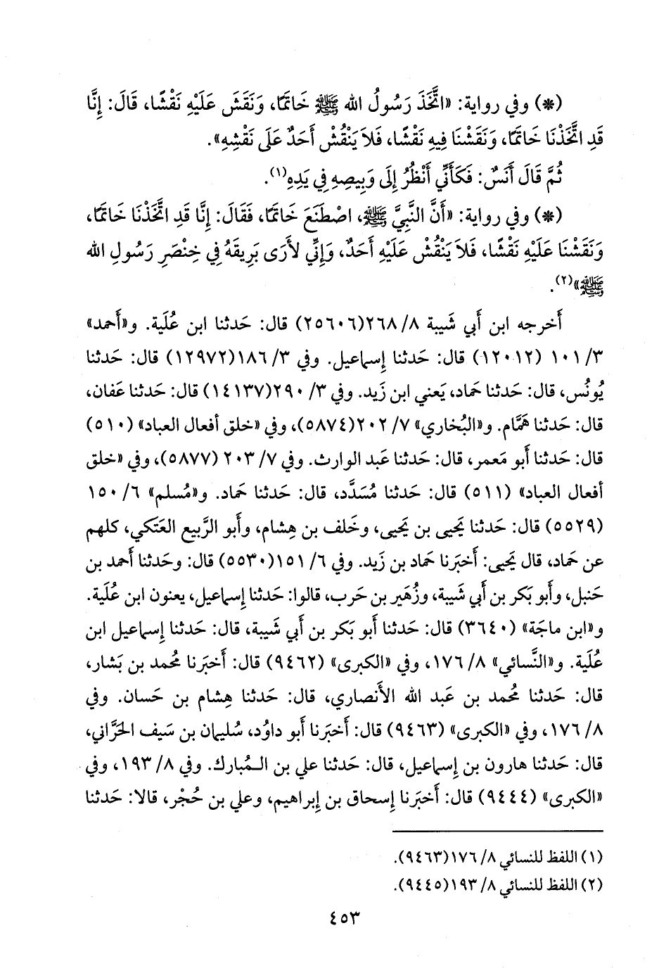 - وفي رواية: «أن النبي صَلى الله عَليه وسَلم اصطنع خاتما، فقال: إنا قد اتخذنا خاتما، ونقشنا عليه نقشا، فلا ينقش عليه أحد، وإني لأرى بريقه في خنصر رسول الله صَلى الله عَليه وسَلم» (¬١).