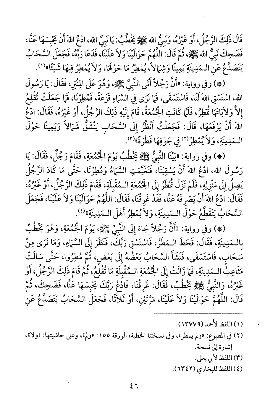 - وفي رواية: «أن رجلا جاء إلى النبي صَلى الله عَليه وسَلم يوم الجمعة، وهو يخطب بالمدينة، فقال: قَحَط المطر، فاستسق ربك، فنظر إلى السماء، وما نرى من سحاب، فاستسقى، فنشأ السحاب بعضه إلى بعض، ثم مطروا، حتى سالت مثاعب المدينة، فما زالت إلى الجمعة المقبلة ما تقلع، ثم قام ذلك الرجل، أو غيره، والنبي صَلى الله عَليه وسَلم يخطب، فقال: غرقنا، فادع ربك يحبسها عنا، فضحك، ثم قال: اللهم حوالينا ولا علينا، مرتين، أو ثلاثا، فجعل السحاب يتصدع عن