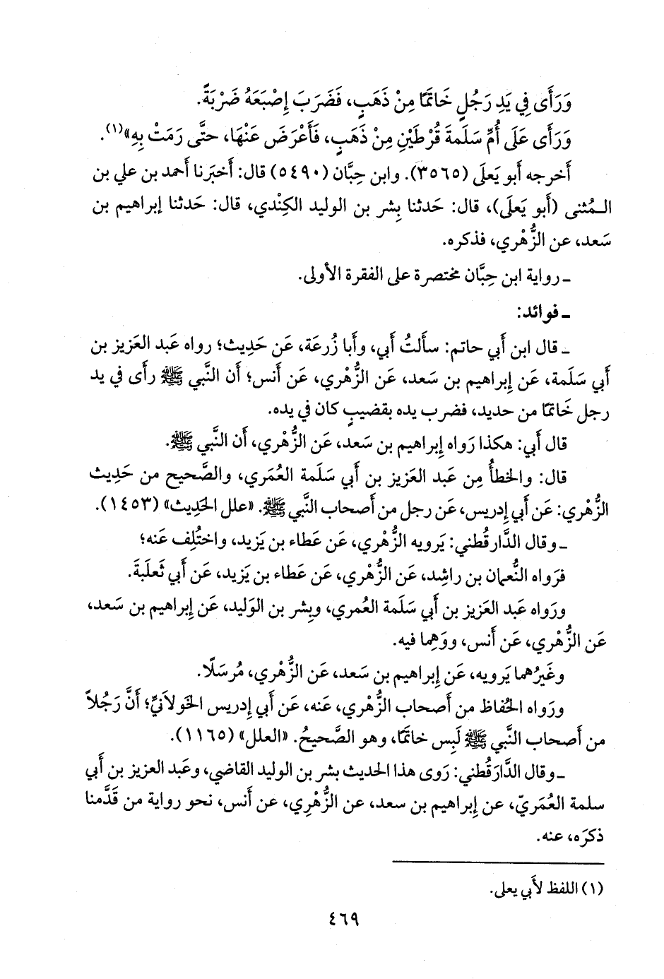ورواه الحفاظ من أصحاب الزُّهْري، عنه، عن أبي إدريس الخَولاني؛ أن رجلا من أصحاب النبي صَلى الله عَليه وسَلم لبس خاتما، وهو الصحيح. «العلل» (١١٦٥).