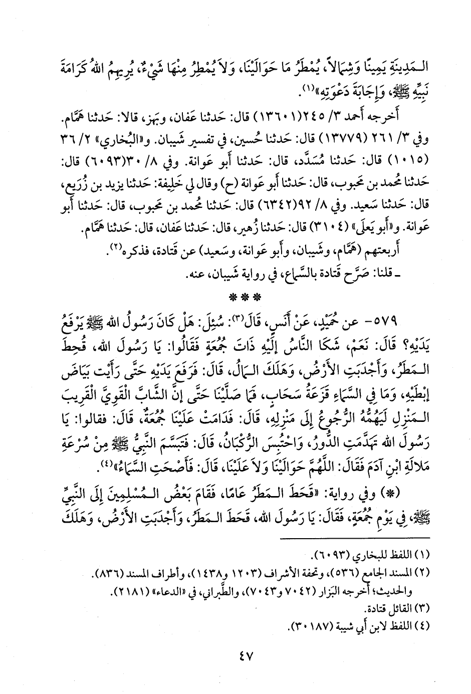 ٥٧٩ - عن حميد، عن أَنس، قال (¬١): سئل: هل كان رسول الله صَلى الله عَليه وسَلم يرفع يديه؟ قال: نعم، شكا الناس إليه ذات جمعة فقالوا: يا رسول الله، قَحَط المطر، وأجدبت الأرض، وهلك المال، قال: فرفع يديه حتى رأيت بياض إبطيه، وما في السماء قزعة سحاب، فما صلينا حتى إن الشاب القوي القريب المنزل ليهمه الرجوع إلى منزله، قال: فدامت علينا جمعة، قال: فقالوا: يا رسول الله تهدمت الدور، واحتبس الركبان، قال: فتبسم النبي صَلى الله عَليه وسَلم من سرعة ملالة ابن آدم فقال: اللهم حوالينا ولا علينا، قال: فأصحت السماء» (¬٢).