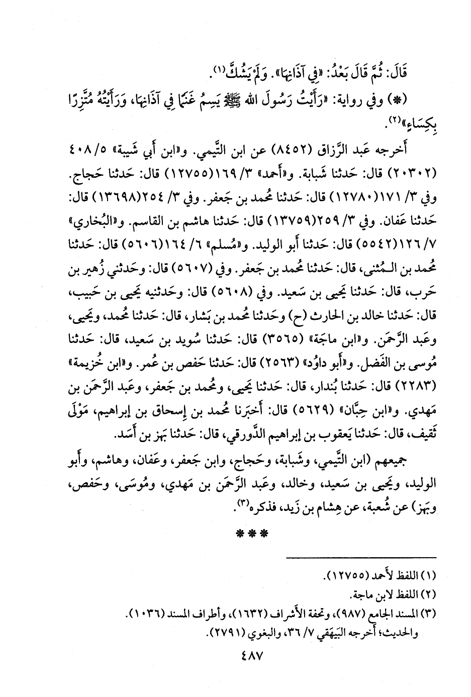 وفي ٣/ ٢٥٤ (١٣٦٩٨) قال: حدثنا عفان. وفي ٣/ ٢٥٩ (١٣٧٥٩) قال: حدثنا هاشم بن القاسم. و «البخاري» ٧/ ٩٧ (٥٥٤٢) قال: حدثنا أَبو الوليد. و «مسلم» ٦/ ١٦٤ (٥٦٠٦) قال: حدثنا محمد بن المثنى، قال: حدثنا محمد بن جعفر. وفي (٥٦٠٧) قال: وحدثني زهير بن حرب، قال: حدثنا يحيى بن سعيد. وفي (٥٦٠٨) قال: وحدثنيه يحيى بن حبيب، قال: حدثنا خالد بن الحارث (ح) وحدثنا محمد بن بشار، قال: حدثنا محمد، ويحيى، وعبد الرَّحمَن. و «ابن ماجة» (٣٥٦٥) قال: حدثنا سويد بن سعيد، قال: حدثنا موسى بن الفضل. و «أَبو داود» (٢٥٦٣) قال: حدثنا حفص بن عمر. و «ابن خزيمة» (٢٢٨٣) قال: حدثنا بُندَار، قال: حدثنا يحيى، ومحمد بن جعفر، وعبد الرَّحمَن بن مهدي. و «ابن حِبَّان» (٥٦٢٩) قال: أخبرنا محمد بن إسحاق بن إبراهيم مولى ثقيف، قال: حدثنا يعقوب بن إبراهيم الدورقي، قال: حدثنا بَهز بن أسد.