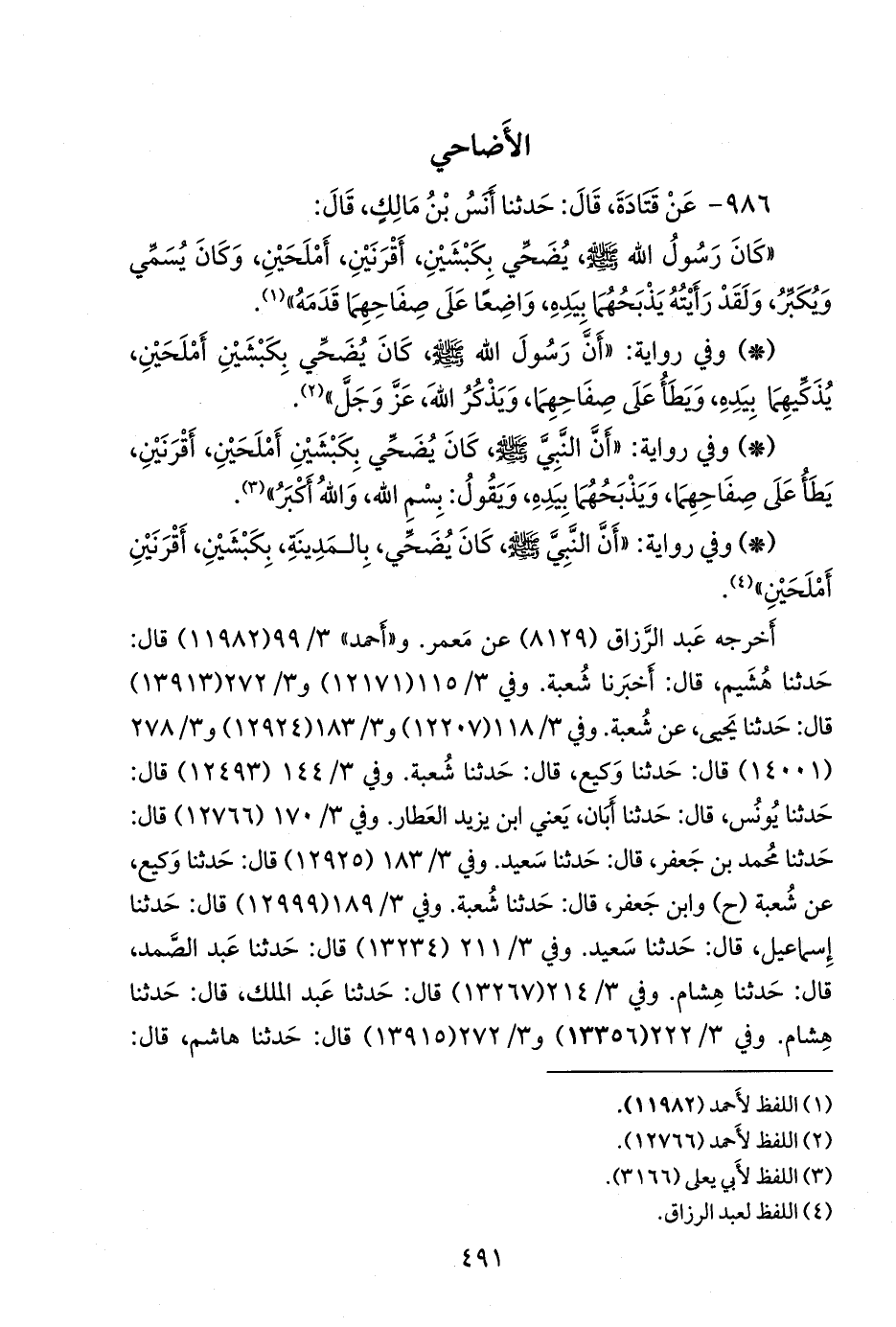 - وفي رواية: «أن النبي صَلى الله عَليه وسَلم كان يضحي بكبشين أملحين، أقرنين، يطأ على صفاحهما، ويذبحهما بيده، ويقول: بسم الله، والله أكبر» (¬٣).