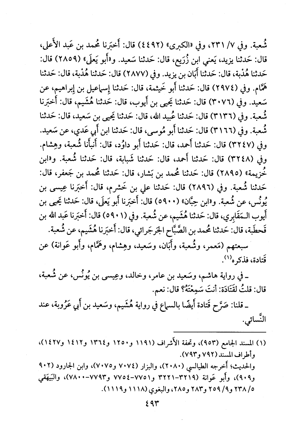 وفي ٧/ ٢٣١، وفي «الكبرى» (٤٤٩٢) قال: أخبرنا محمد بن عبد الأعلى، قال: حدثنا يزيد، يعني ابن زُريع، قال: حدثنا سعيد. و «أَبو يَعلى» (٢٨٥٩) قال: حدثنا هُدبة، قال: حدثنا أَبَان بن يزيد. وفي (٢٨٧٧) قال: حدثنا هُدبة، قال: حدثنا همام. وفي (٢٩٧٤) قال: حدثنا أَبو خيثمة، قال: حدثنا إسماعيل بن إبراهيم، عن سعيد. وفي (٣٠٧٦) قال: حدثنا يحيى بن أيوب، قال: حدثنا هُشيم، قال: أخبرنا شعبة. وفي (٣١٣٦) قال: حدثنا عُبيد الله، قال: حدثنا يحيى بن سعيد، قال: حدثنا شعبة. وفي (٣١٦٦) قال: حدثنا أَبو موسى، قال: حدثنا ابن أَبي عَدي، عن سعيد. وفي (٣٢٤٧) قال: حدثنا أحمد، قال: حدثنا أَبو داود، قال: أنبأنا شعبة، وهشام. وفي (٣٢٤٨) قال: حدثنا أحمد، قال: حدثنا شَبَابة، قال: حدثنا شعبة. و «ابن خزيمة» (٢٨٩٥) قال: حدثنا محمد بن بشار، قال: حدثنا محمد بن جعفر، قال: حدثنا شعبة. وفي (٢٨٩٦) قال: حدثنا علي بن خَشرَم، قال: أخبرنا عيسى بن يونس، عن شعبة. و «ابن حِبَّان» (٥٩٠٠) قال: أخبرنا أَبو يَعلى، قال: حدثنا يحيى بن أيوب المقابري، قال: حدثنا هُشيم، عن شعبة. وفي (٥٩٠١) قال: أخبرنا عبد الله بن قَحطَبة، قال: حدثنا محمد بن الصباح الجرجرائي، قال: أخبرنا هُشيم، عن شعبة.
