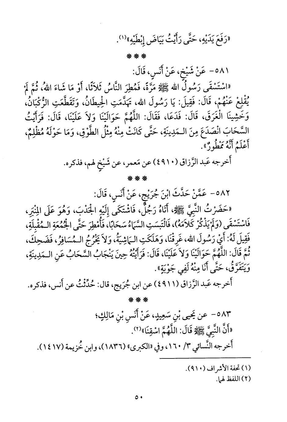 «استسقى رسول الله صَلى الله عَليه وسَلم مرة، فمطر الناس ثلاثا، أو ما شاء الله، ثم لم يقلع عنهم، قال: فقيل: يا رسول الله، تهدمت الحيطان، وتقطعت الركبان، وخشينا الغرق، قال: فدعا، فقال: اللهم حوالينا ولا علينا، قال: فرأيت السحاب انصدع من المدينة، حتى كانت منه مثل الطوق، وما حوله مظلم، أعلم أنه ممطور».