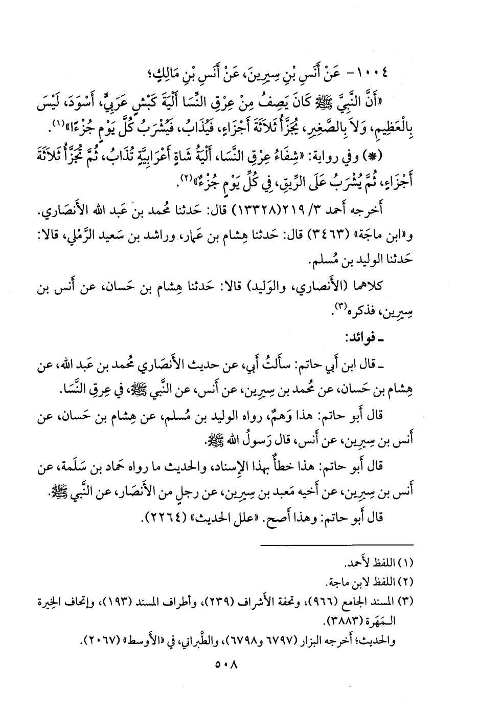 - قلنا: إسناده ضعيفٌ؛ قال ابن أبي حاتم: سألت أبي، عن حديث الأَنصاري محمد بن عبد الله، عن هشام بن حسان، عن محمد بن سِيرين، عن أَنس، عن النبي صَلى الله عَليه وسَلم في عرق النسا.