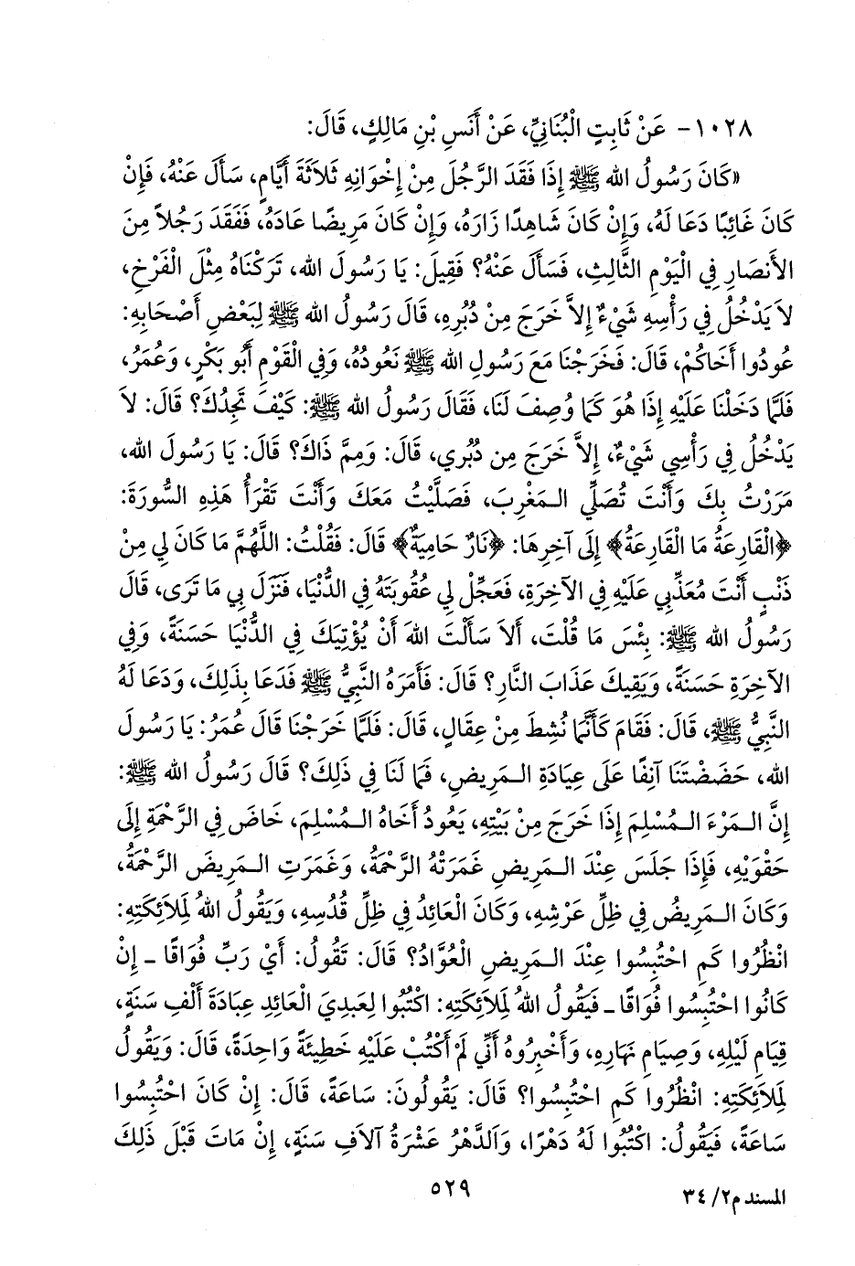 «كان رسول الله صَلى الله عَليه وسَلم إذا فقد الرجل من إخوانه ثلاثة أيام، سأل عنه، فإن كان غائبا دعا له، وإن كان شاهدا زاره، وإن كان مريضا عاده، ففقد رجلا من الأنصار في اليوم الثالث، فسأل عنه؟ فقيل: يا رسول الله، تركناه مثل الفرخ، لا يدخل في رأسه شيء إلا خرج من دبره، قال رسول الله صَلى الله عَليه وسَلم لبعض أصحابه: عودوا أخاكم، قال: فخرجنا مع رسول الله صَلى الله عَليه وسَلم نعوده، وفي القوم أَبو بكر، وعمر، فلما دخلنا عليه إذا هو كما وصف لنا، فقال رسول الله صَلى الله عَليه وسَلم: كيف تجدك؟ قال: لا يدخل في رأسي شيء، إلا خرج من دبري، قال: ومم ذاك؟ قال: يا رسول الله، مررت بك وأنت تصلي المغرب، فصليت معك وأنت تقرأ هذه السورة: {القارعة. ما القارعة} إلى آخرها: {نار حامية} قال: فقلت: اللهم ما كان لي من ذنب أنت معذبي عليه في الآخرة، فعجل لي عقوبته في الدنيا، فنزل بي ما ترى، قال رسول الله صَلى الله عَليه وسَلم: بئس ما قلت، ألا سألت الله أن يؤتيك في الدنيا حسنة، وفي الآخرة حسنة، ويقيك عذاب النار؟ قال: فأمره النبي صَلى الله عَليه وسَلم فدعا بذلك، ودعا له النبي صَلى الله عَليه وسَلم قال: فقام كأنما نشط من عقال، قال: فلما خرجنا قال عمر: يا رسول الله، حضضتنا آنفا على عيادة المريض، فما لنا في ذلك؟ قال رسول الله صَلى الله عَليه وسَلم: إن المرء المسلم إذا خرج من بيته، يعود أخاه المسلم، خاض في الرحمة إلى حقويه، فإذا جلس عند المريض غمرته الرحمة، وغمرت المريض الرحمة، وكان المريض في ظل عرشه، وكان العائد في ظل قدسه، ويقول الله لملائكته: انظروا كم احتبسوا عند المريض العواد؟ قال: تقول: أي رب فواقا ـ إن كانوا احتبسوا فواقا ـ فيقول الله لملائكته: اكتبوا لعبدي العائد عبادة ألف سنة، قيام ليله، وصيام نهاره، وأخبروه أني لم أكتب عليه خطيئة واحدة، قال: ويقول لملائكته: انظروا كم احتبسوا؟ قال: يقولون: ساعة، قال: إن كان احتبسوا ساعة، فيقول: اكتبوا له دهرا، والدهر عشرة آلاف سنة، إن مات قبل ذلك