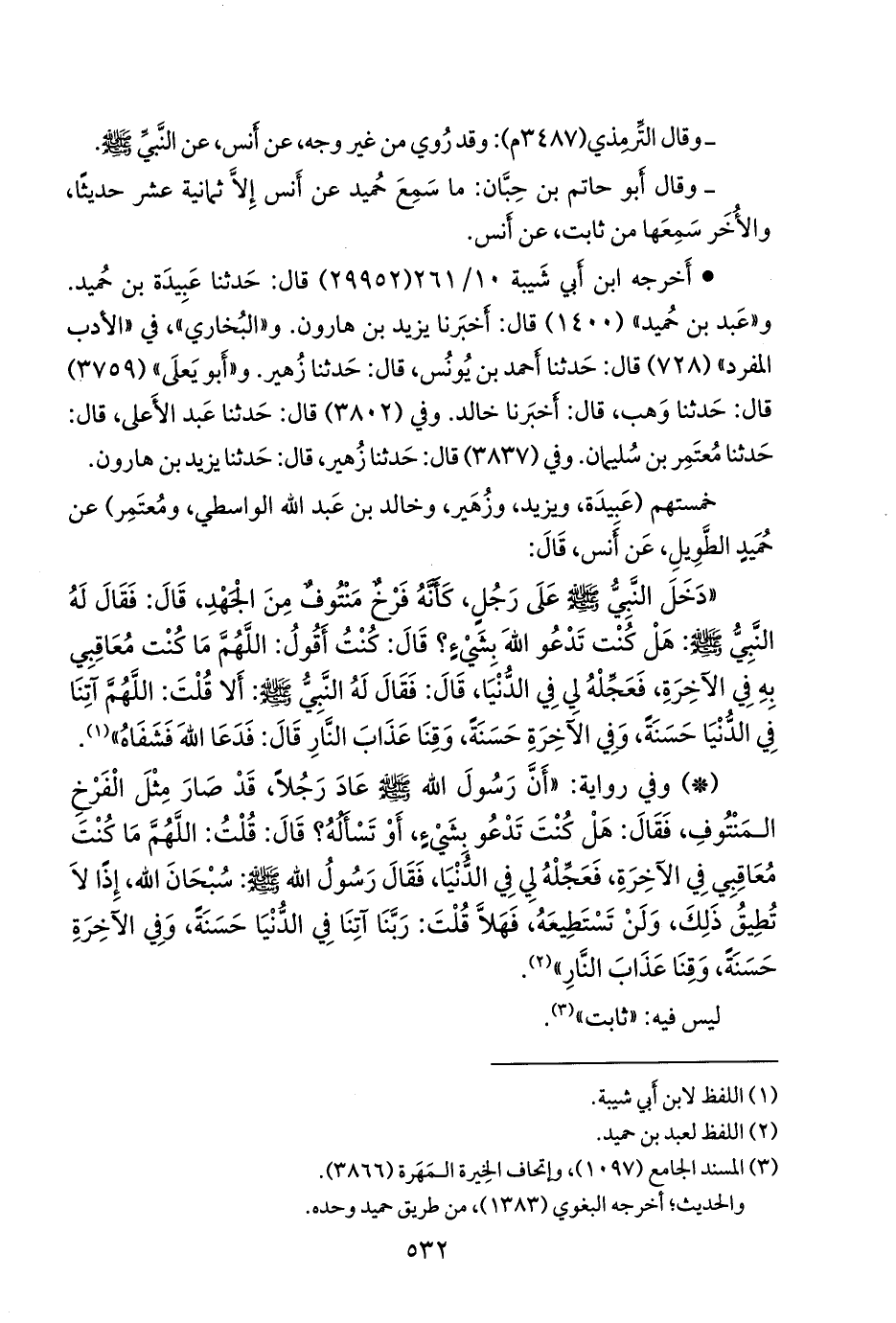 - وفي رواية: «أن رسول الله صَلى الله عَليه وسَلم عاد رجلا، قد صار مثل الفرخ المنتوف، فقال: هل كنت تدعو بشيء، أو تسأله؟ قال: قلت: اللهم ما كنت معاقبي في الآخرة، فعجله لي في الدنيا، فقال رسول الله صَلى الله عَليه وسَلم: سبحان الله، إذا لا تطيق ذلك، ولن تستطيعه، فهلا قلت: ربنا آتنا في الدنيا حسنة، وفي الآخرة حسنة، وقنا عذاب النار» (¬٢).