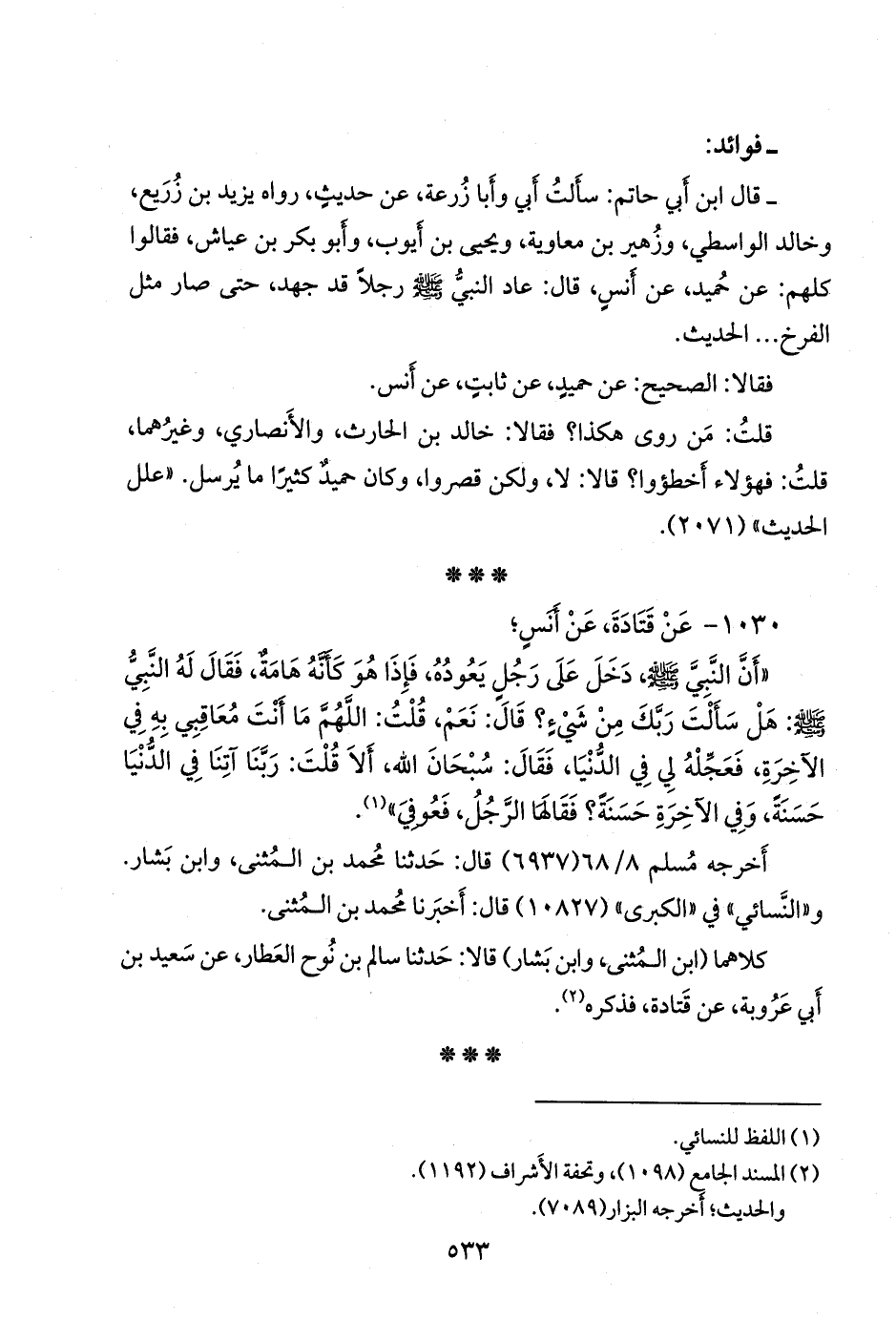 - قال عبد الرَّحمَن بن أبي حاتم الرازي: سألت أبي وأَبا زُرعَة، عن حديث، رواه يزيد بن زُريع، وخالد الواسطي، وزهير بن معاوية، ويحيى بن أيوب، وأَبو بكر بن عياش، فقالوا كلهم: عن حميد، عن أَنس، قال: عاد النبي صَلى الله عَليه وسَلم رجلا قد جهد، حتى صار مثل الفرخ، الحديث.