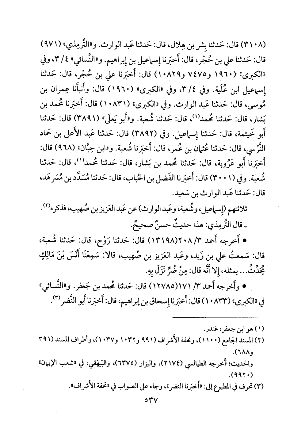 وفي (٣٨٩٢) قال: حدثنا عبد الأعلى بن حماد النَّرْسي، قال: حدثنا عثمان بن عمر، قال: أخبرنا شعبة. و «ابن حِبَّان» (٩٦٨) قال: أخبرنا أَبو عَروبَة، قال: حدثنا محمد بن بشار، قال: حدثنا محمد (¬١)، قال: حدثنا شعبة. وفي (٣٠٠١) قال: أخبرنا الفضل بن الحُبَاب، قال: حدثنا مُسَدد بن مُسَرهد، قال: حدثنا عبد الوارث بن سعيد.