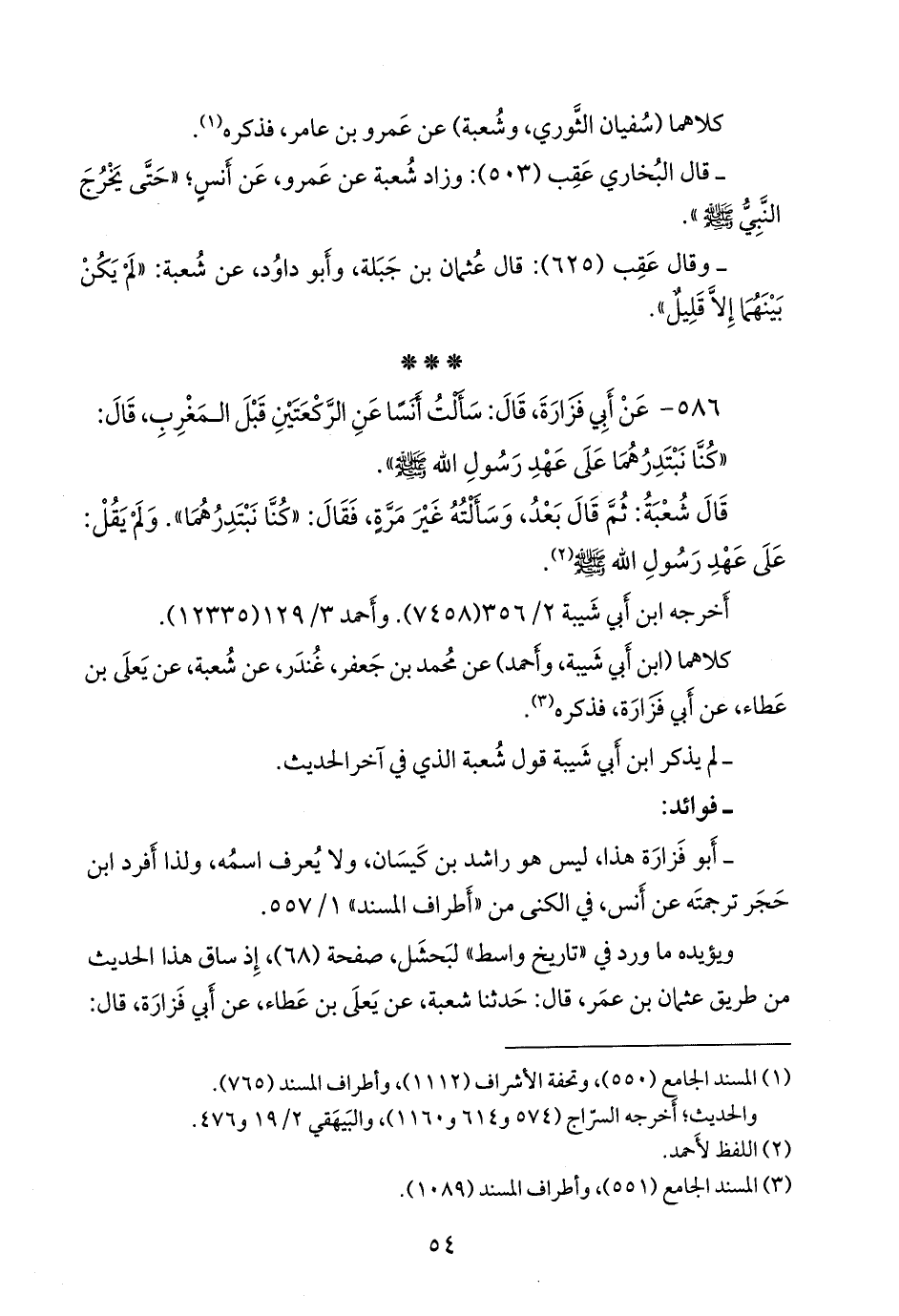٥٨٦ - عن أبي فزارة، قال: سألت أنسا عن الركعتين قبل المغرب، قال: