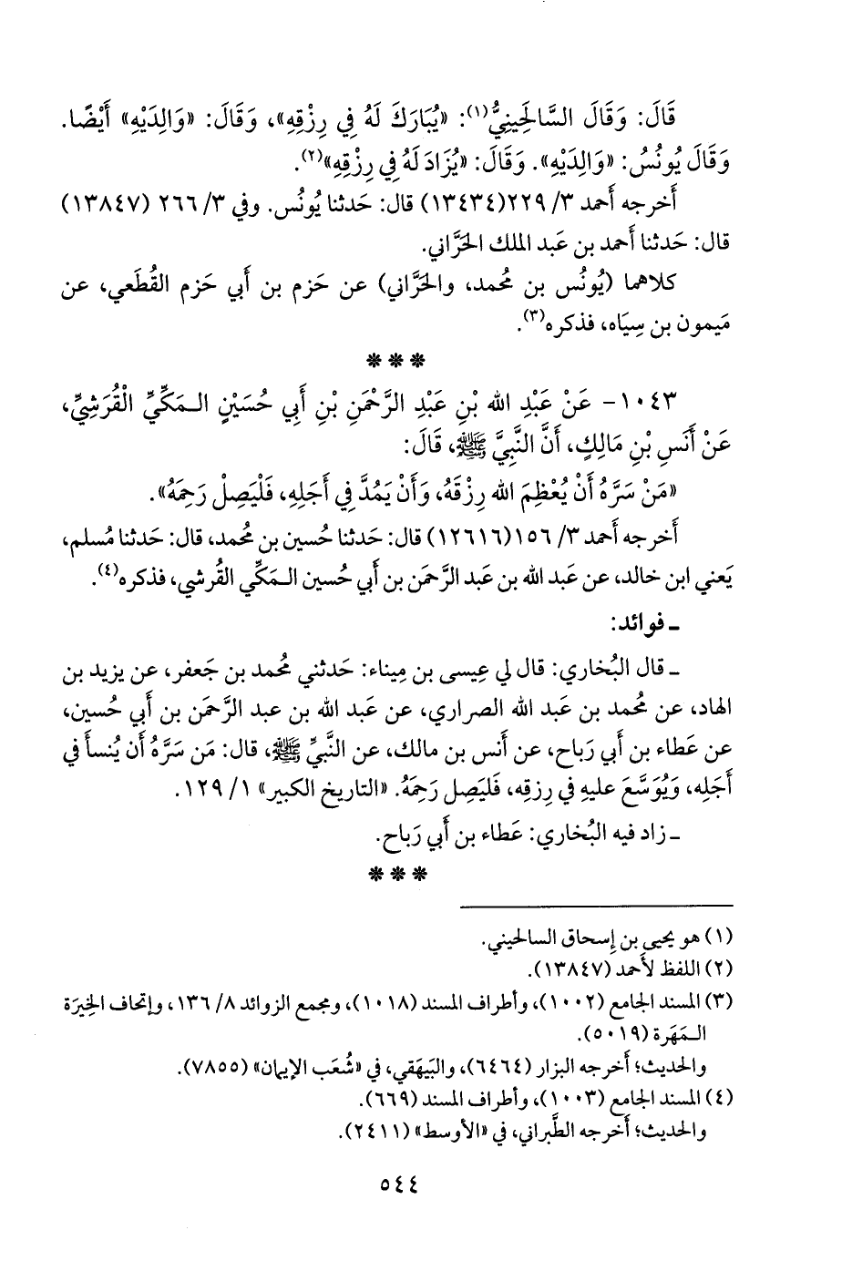 - قال البخاري: قال لي عيسى بن ميناء: حدثني محمد بن جعفر، عن يزيد بن الهاد، عن محمد بن عبد الله الصراري، عن عبد الله بن عبد الرَّحمَن بن أبي حسين، عن عطاء بن أبي رباح، عن أَنس بن مالك، عن النبي صَلى الله عَليه وسَلم قال: من سره أن ينسأ في أجله، ويوسع عليه في رزقه، فليصل رحمه. «التاريخ الكبير» ١/ ١٢٩.
