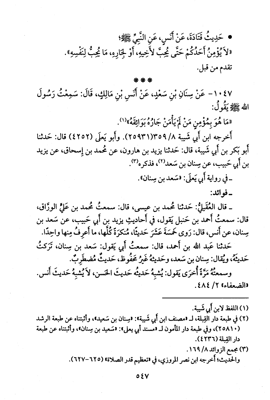 (¬٢) هكذا في عامة النسخ الخطية لـ «مصنف ابن أَبي شيبة»، وطبعتي دار القِبلة وإشبيليا: «سنان بن سعيد»، قال مسلم بن الحجاج: سعد بن سنان الكندي، في رواية الليث، وقال عمرو بن الحارث، عن يزيد: «عن سنان بن سعد»، وقال ابن إسحاق: «سنان بن سعيد». «المُنفردات والوِحدان» ١/ ٢٠٧.