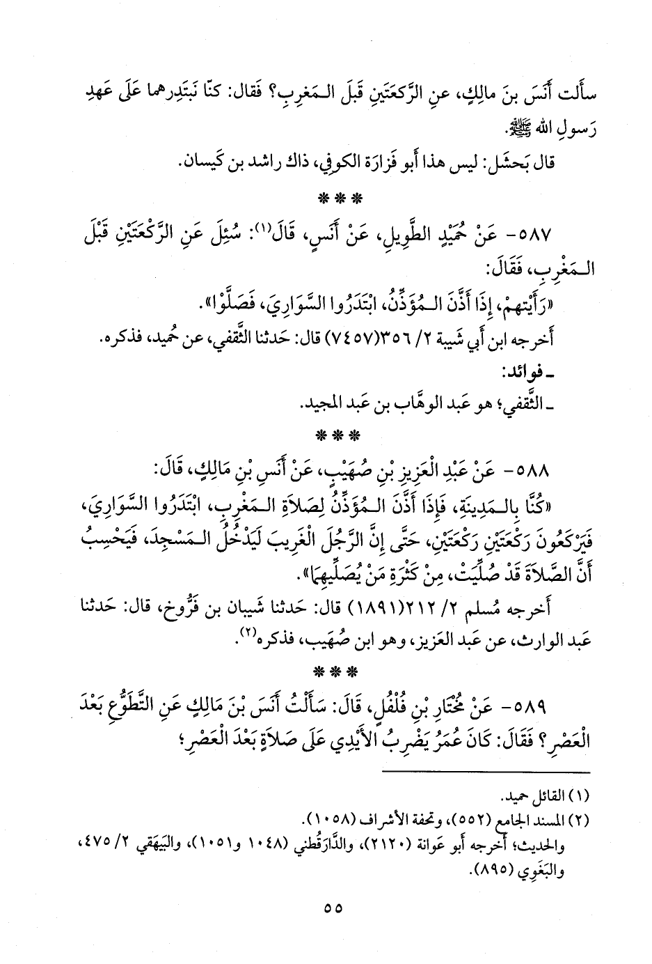 ٥٨٧ - عن حميد الطويل، عن أَنس، قال (¬١): سُئِل عن الركعتين قبل المغرب، فقال: