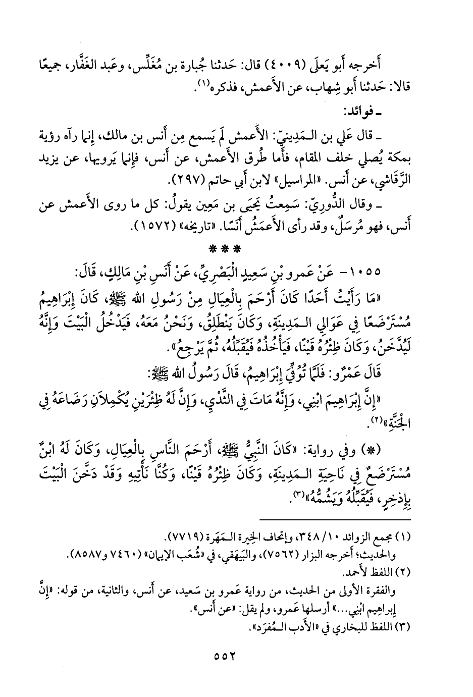 والفقرة الأولى من الحديث، من رواية عَمرو بن سعيد، عن أَنس، والثانية، من قوله: «إن إبراهيم ابني ... » أرسلها عَمرو، ولم يقل: «عن أَنس».