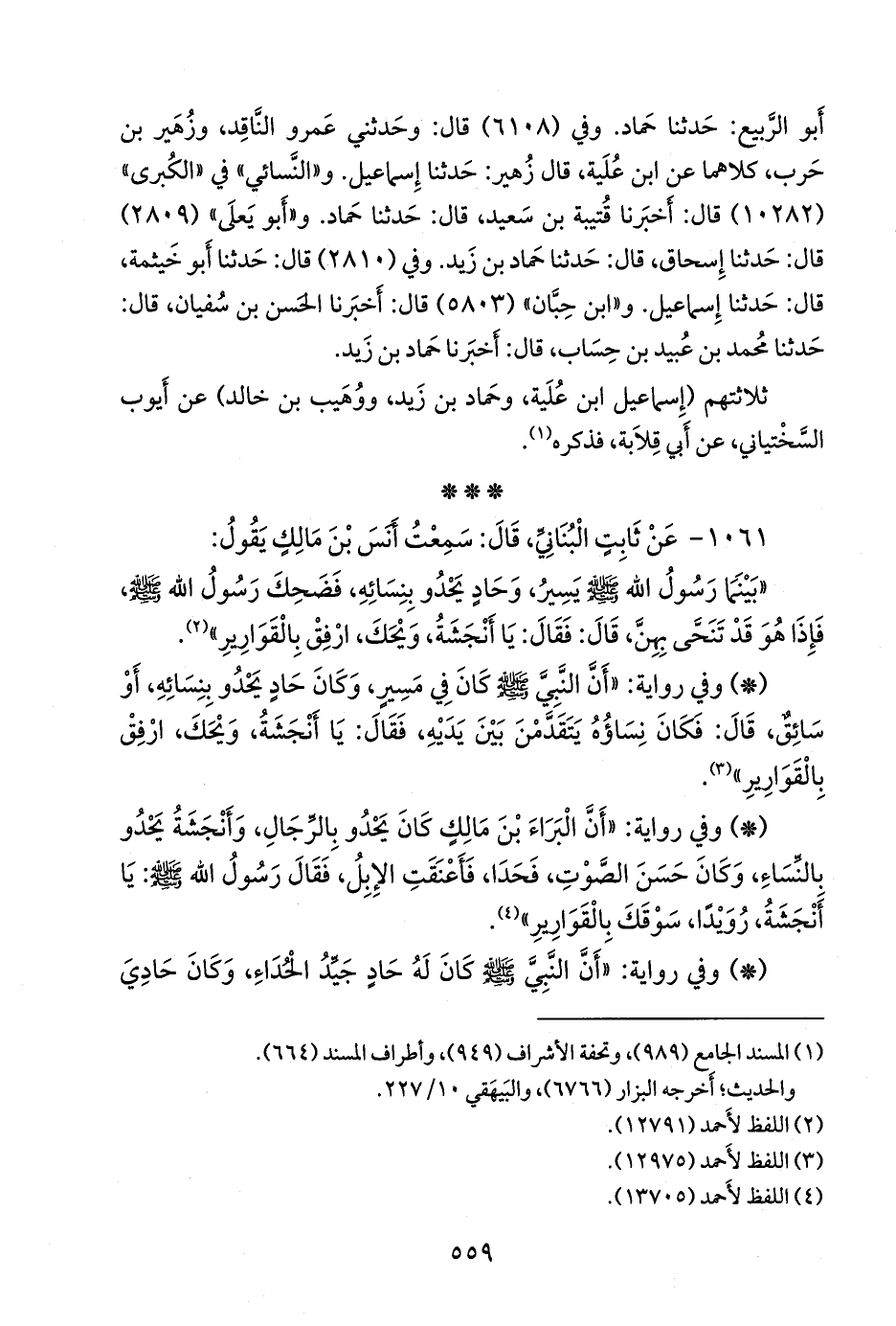 - وفي رواية: «أن البراء بن مالك كان يحدو بالرجال، وأنجشة يحدو بالنساء، وكان حسن الصوت، فحدا، فأعنقت الإبل، فقال رسول الله صَلى الله عَليه وسَلم: يا أنجشة، رويدا، سوقك بالقوارير» (¬٣).