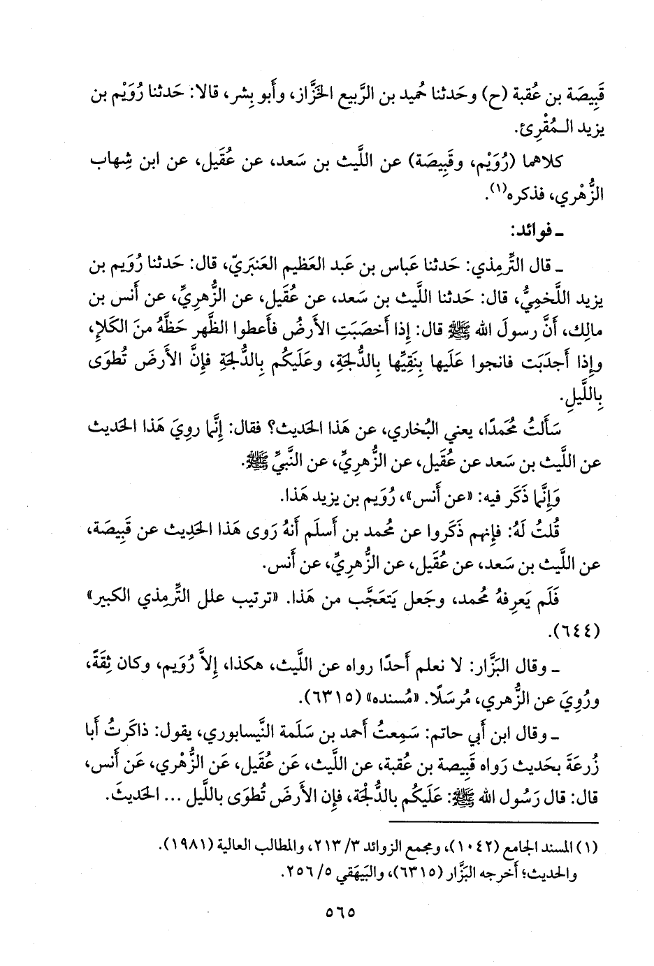 - قال التِّرمِذي: حدثنا عباس بن عبد العظيم العنبري، قال: حدثنا رويم بن يزيد اللخمي، قال: حدثنا الليث بن سعد، عن عقيل، عن الزُّهْري، عن أَنس بن مالك، أن رسول الله صَلى الله عَليه وسَلم قال: إذا أخصبت الأرض فأعطوا الظهر حظه من الكلإ، وإذا أجدبت فانجوا عليها بنقيها بالدلجة، وعليكم بالدلجة فإن الأرض تطوى بالليل.