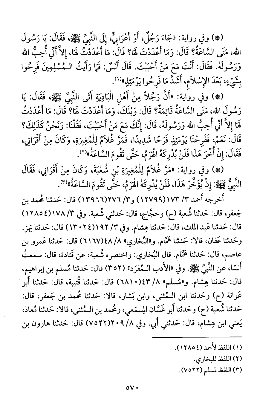 «أن رجلا سأل النبي صَلى الله عَليه وسَلم فقال: الرجل يحب القوم، ولما يلحق بهم؟ قال: المرء مع من أحب».