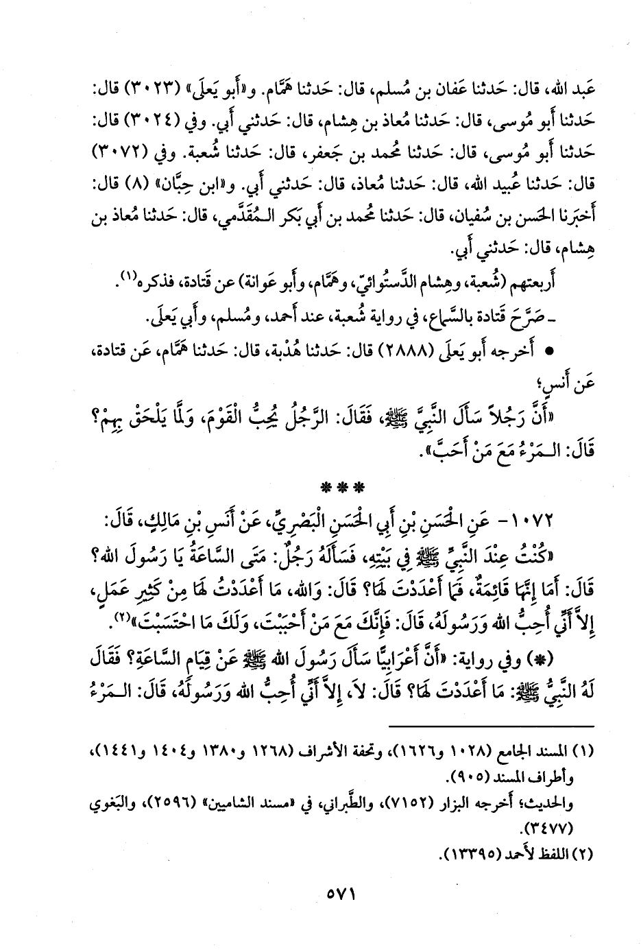 - وفي رواية: «أن أعرابيا سأل رسول الله صَلى الله عَليه وسَلم عن قيام الساعة؟ فقال له النبي صَلى الله عَليه وسَلم: ما أعددت لها؟ قال: لا، إلا أني أحب الله ورسوله، قال: المرء