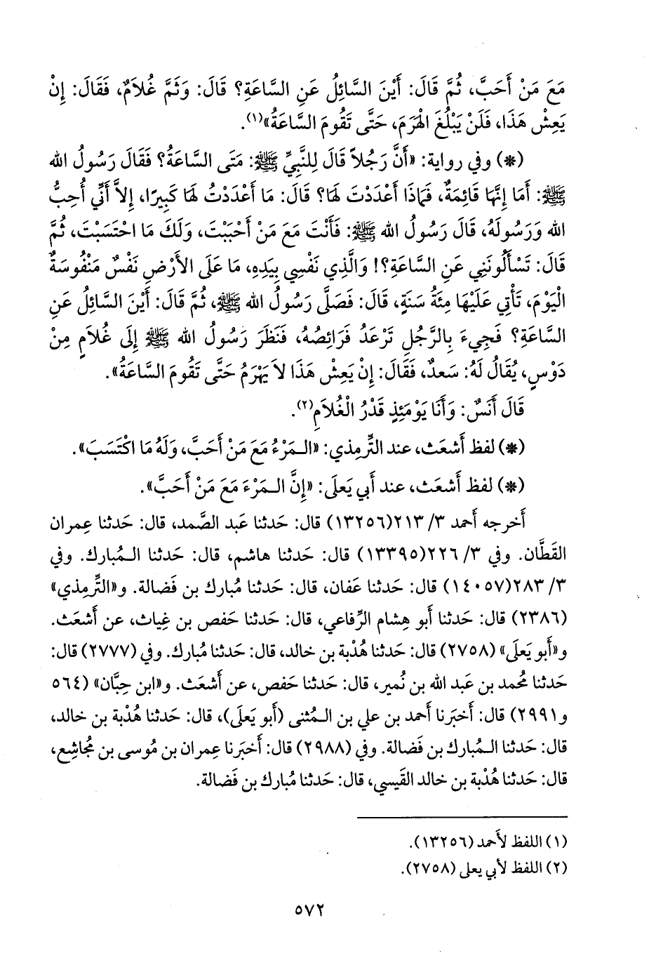- لفظ أشعث، عند أبي يَعلى: «إن المرء مع من أحب».