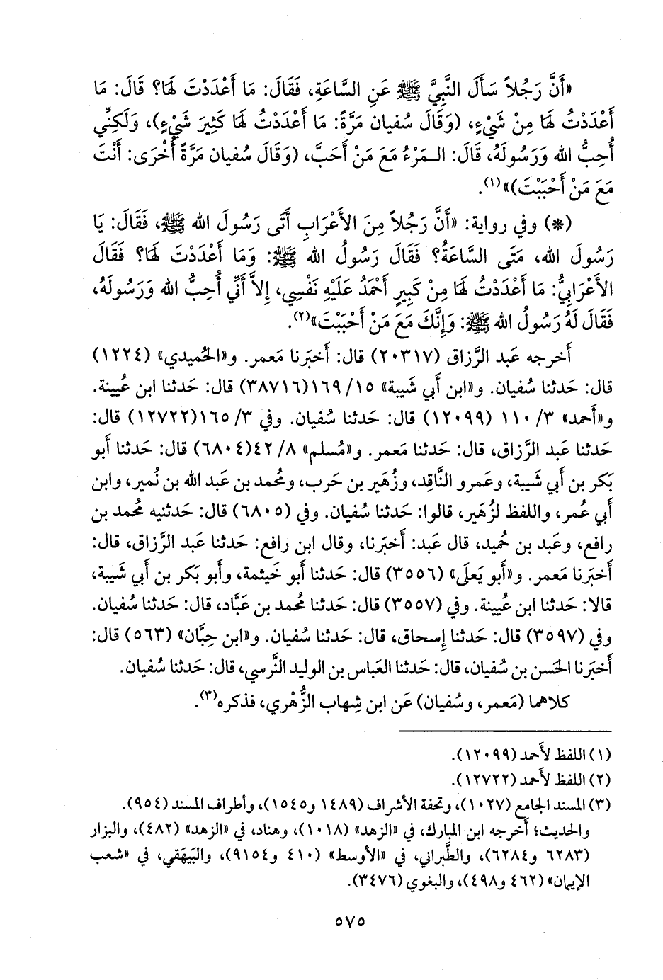 وفي ٣/ ١٦٥ (١٢٧٢٢) قال: حدثنا عبد الرزاق، قال: حدثنا مَعمَر. و «مسلم» ٨/ ٤٢ (٦٨٠٤) قال: حدثنا أَبو بكر بن أبي شيبة، وعَمرو الناقد، وزهير بن حرب، ومحمد بن عبد الله بن نُمير، وابن أبي عمر، واللفظ لزهير، قالوا: حدثنا سفيان. وفي (٦٨٠٥) قال: حدثنيه محمد بن رافع، وعَبد بن حُميد، قال عبد: أخبرنا، وقال ابن رافع: حدثنا عبد الرزاق، قال: أخبرنا مَعمَر. و «أَبو يَعلى» (٣٥٥٦) قال: حدثنا أَبو خيثمة، وأَبو بكر بن أبي شيبة، قالا: حدثنا ابن عُيينة. وفي (٣٥٥٧) قال: حدثنا محمد بن عباد، قال: حدثنا سفيان. وفي (٣٥٩٧) قال: حدثنا إسحاق، قال: حدثنا سفيان. و «ابن حِبَّان» (٥٦٣) قال: أخبرنا الحسن بن سفيان، قال: حدثنا العباس بن الوليد النَّرْسي، قال: حدثنا سفيان.