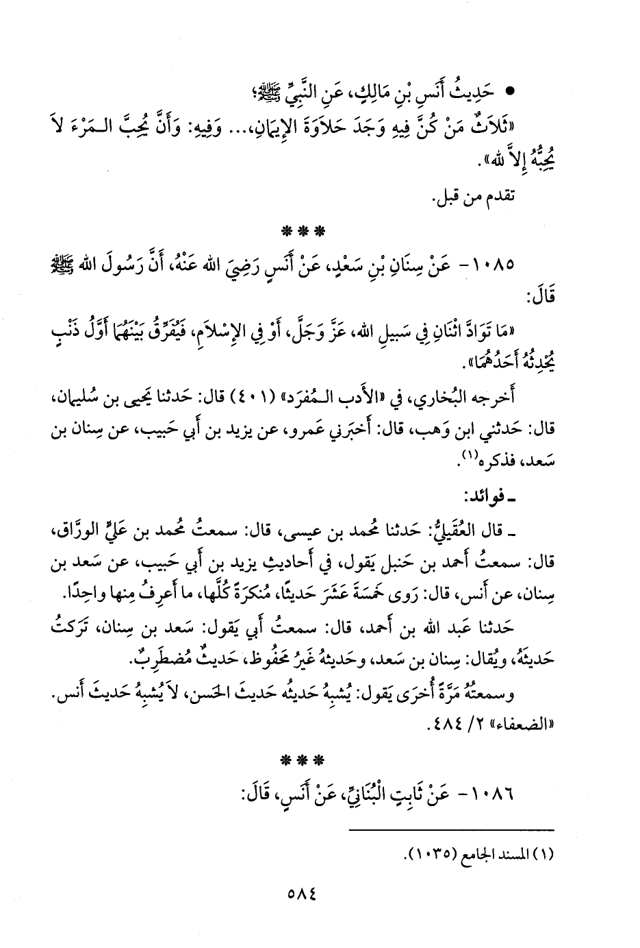 ١٠٨٥ - عن سنان بن سعد، عن أَنس رضي الله عنه، أن رسول الله صَلى الله عَليه وسَلم قال: