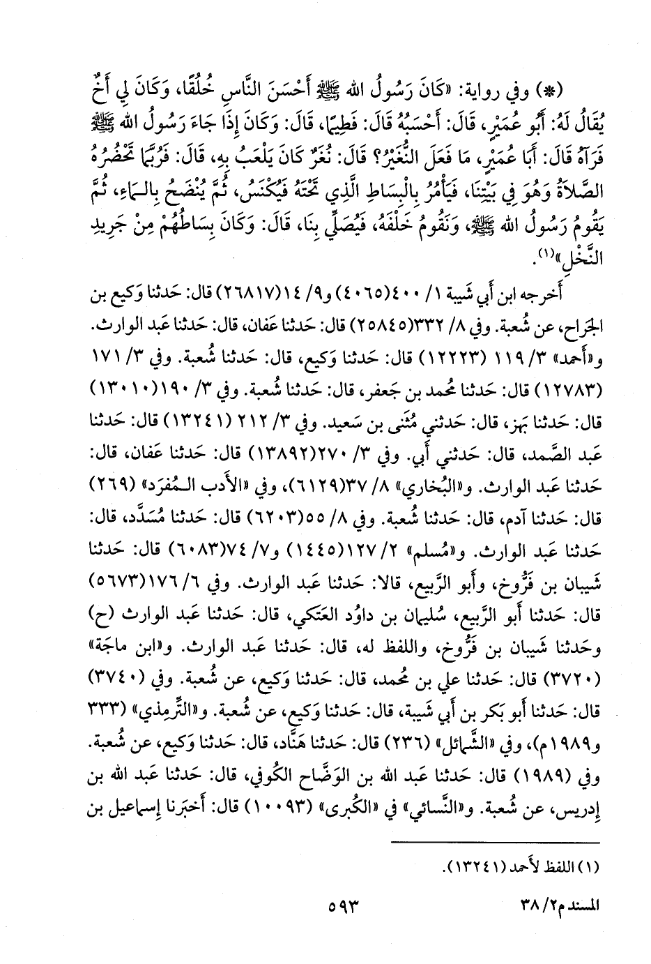 مسعود، قال: حدثنا يزيد بن زُريع، قال: حدثنا شعبة. وفي (١٠٠٩٤) قال: أخبرنا إسحاق بن إبراهيم، قال: أخبرنا وكيع، قال: حدثنا شعبة. وفي (١٠٠٩٥) قال: أخبرنا إسحاق بن إبراهيم، قال: أخبرنا أزهر بن القاسم، قال: حدثنا المثنى بن سعيد الضبعي. و «ابن حِبَّان» (٢٣٠٨) قال: أخبرنا عبد الله بن محمد الأزدي، قال: حدثنا إسحاق بن إبراهيم، قال: حدثنا وكيع، عن شعبة. وفي (٢٥٠٦) قال: أخبرنا أَبو خليفة، قال: حدثنا أَبو الوليد، قال: حدثنا شعبة.