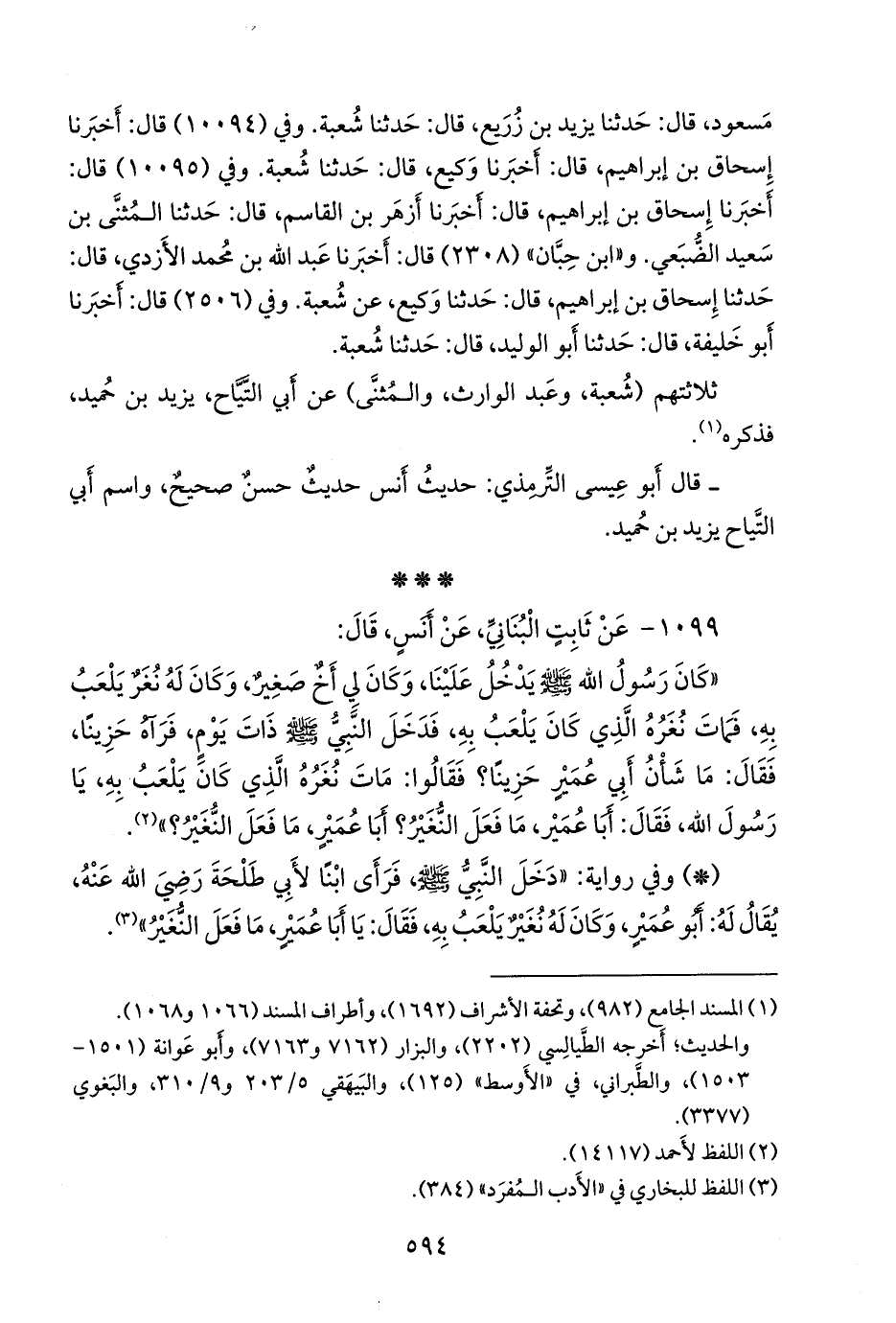 «كان رسول الله صَلى الله عَليه وسَلم يدخل علينا، وكان لي أخ صغير، وكان له نغر يلعب به، فمات نغره الذي كان يلعب به، فدخل النبي صَلى الله عَليه وسَلم ذات يوم، فرآه حزينا، فقال: ما شأن أبي عمير حزينا؟ فقالوا: مات نغره الذي كان يلعب به، يا رسول الله، فقال: أبا عمير، ما فعل النغير؟ أبا عمير، ما فعل النغير؟» (¬١).