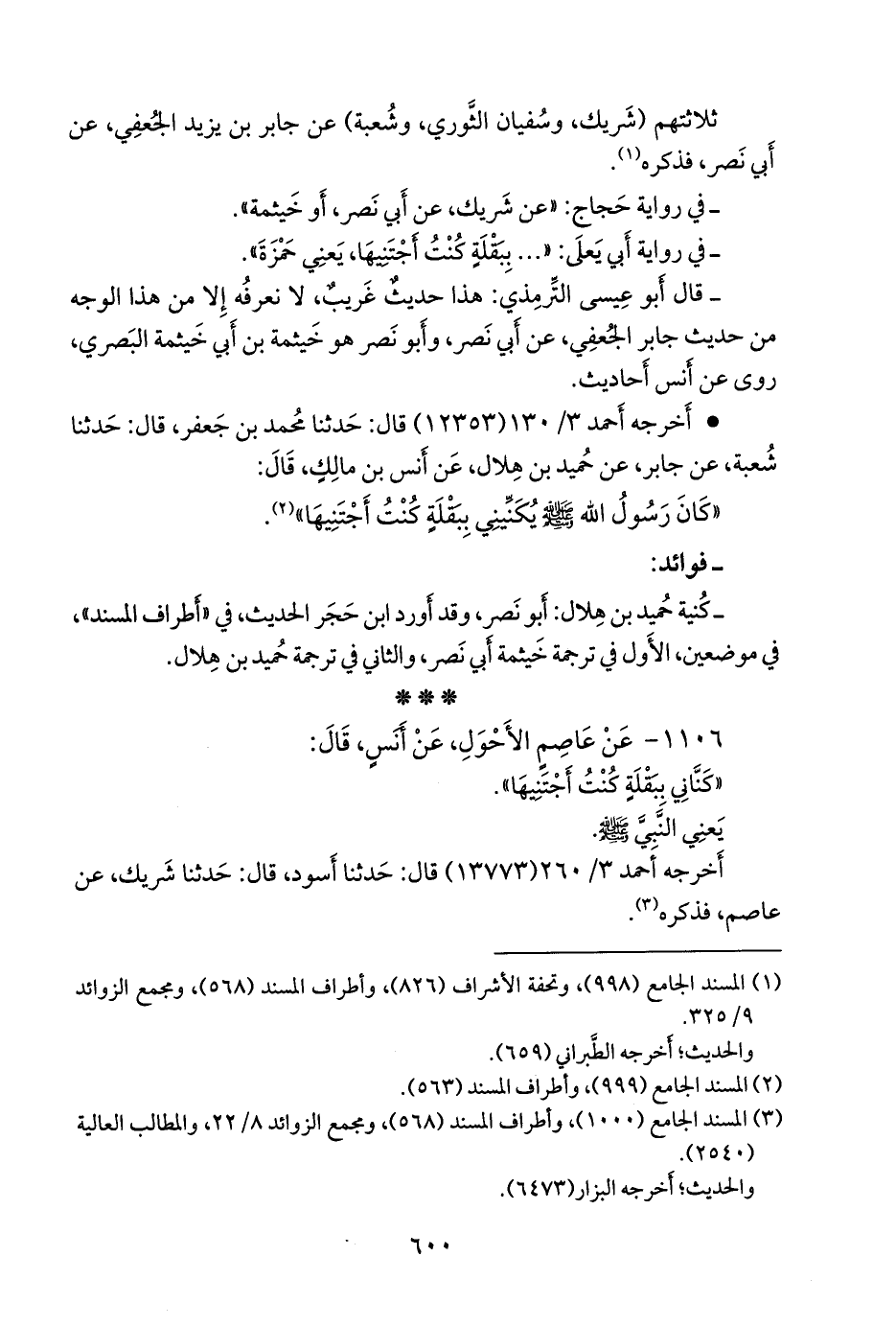 - كنية حميد بن هلال: أَبو نصر، وقد أورد ابن حجر الحديث في «أطراف المسند»، في موضعين، الأول في ترجمة خيثمة أبي نصر، والثاني في ترجمة حميد بن هلال.