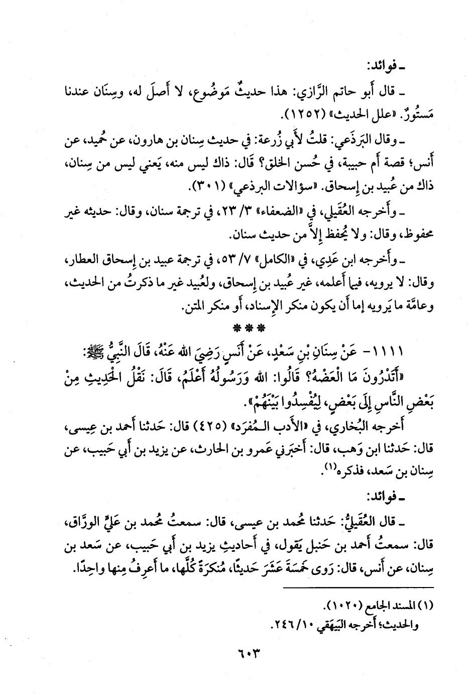 - قلنا: إِسناده ضعيفٌ؛ سعد بن سِنان، ويُقال: سِنان بن سعد، الكِندي المِصري، ليس بثقة، وأَحاديث يزيد بن أَبي حبيب، عن سعد بن سِنان، أَو سنان بن سعد، عن أَنس، منكرةٌ كُلها. انظر فوائد الحديث رقم (٢٦٩).