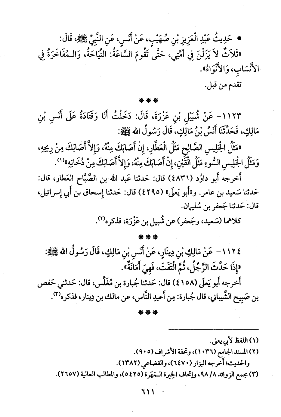 ١١٢٣ - عن شبيل بن عَزرة، قال: دخلت أنا وقتادة على أَنس بن مالك، فحدثنا أَنس بن مالك، قال: قال رسول الله صَلى الله عَليه وسَلم: