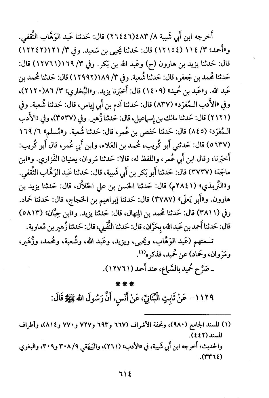 ١١٢٩ - عن ثابت البُنَاني، عن أَنس، أن رسول الله صَلى الله عَليه وسَلم قال: