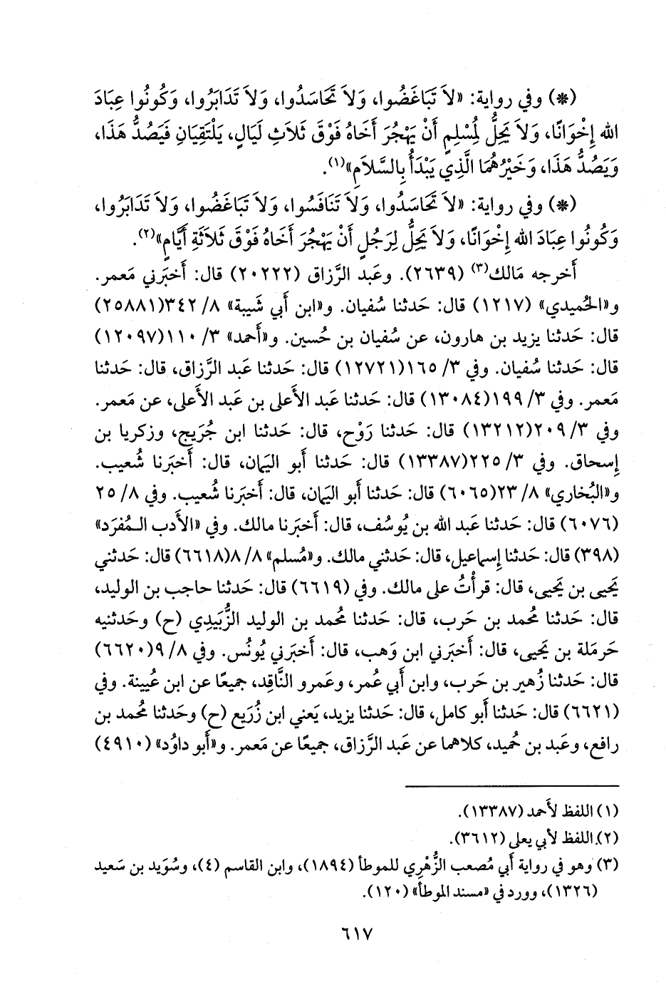 قال: حدثنا عبد الله بن مَسلَمة، عن مالك. و «التِّرمِذي» (١٩٣٥) قال: حدثنا عبد الجبار بن العلاء العطار، وسعيد بن عبد الرَّحمَن، قالا: حدثنا سفيان. و «أَبو يَعلى» (٣٥٤٩) قال: حدثنا أَبو خيثمة، قال: حدثنا ابن عُيينة. وفي (٣٥٥٠) قال: حدثنا محمد بن عباد المكي، قال: حدثنا سفيان. وفي (٣٥٥١) قال: حدثنا ابن أبي شيبة، قال: حدثنا يزيد بن هارون، قال: أخبرنا سفيان بن حسين. وفي (٣٦١٢) قال: حدثنا وهب بن بقية الواسطي، قال: أخبرنا خالد، عن عبد الرَّحمَن بن إسحاق. و «ابن حِبَّان» (٥٦٦٠) قال: أخبرنا عمر بن سعيد بن سنان، قال: أخبرنا أحمد بن أَبي بكر، عن مالك.
